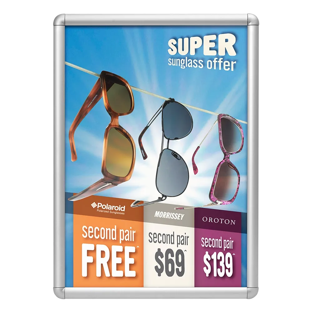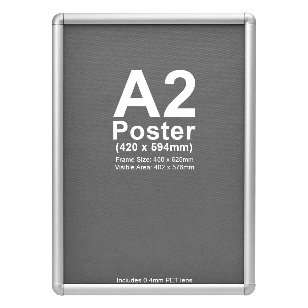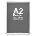 The snap frame holder, A2 picture frame is made from aluminium with a silver finish for a durable unit that can easily work with any décor. The professional look of the display helps to draw passersby attention towards the center of the display! The low-cost of this unit coupled with the great look make it a great choice for any business.
