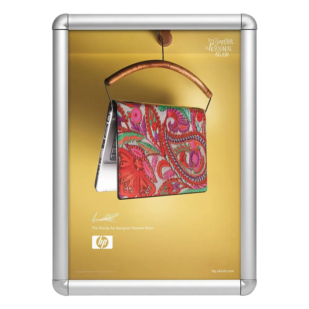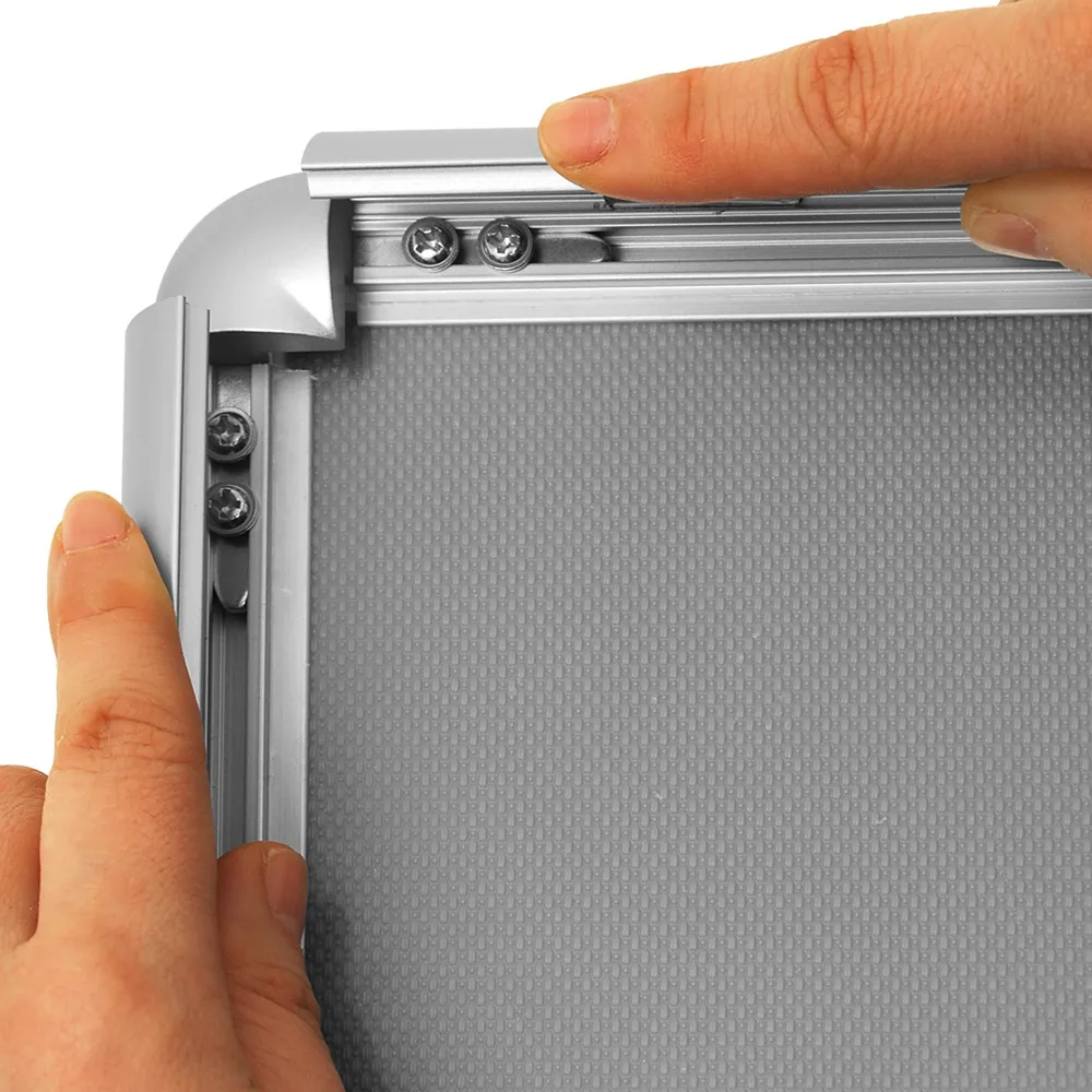 The silver finish on these displays allow them to be placed in any décor without issue. These clip frames make switching out graphics simple as well in under a minute without using any tools. Each of the four sides snap open to reveal the interior easily! The corners of the display are also rounded in order to provide a safe unit.