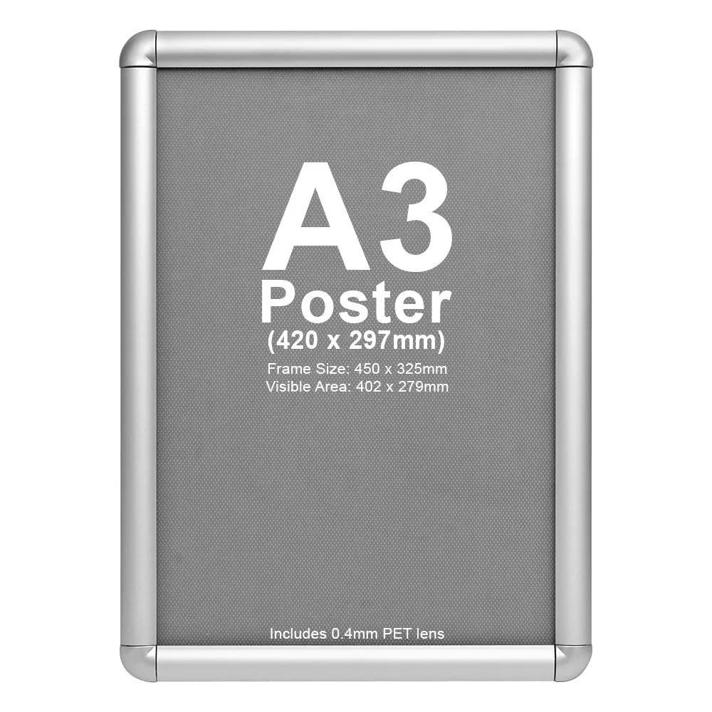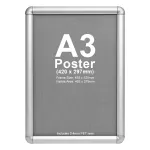 The clip frame poster holder, A3 picture frame is designed to hold A3 (420 x 297mm) standard sized posters in either landscape or portrait orientation for a versatile display for use in different locations. The frames are made out of aluminium in order to provide a lightweight unit that is available at an inexpensive cost without compromising on quality!