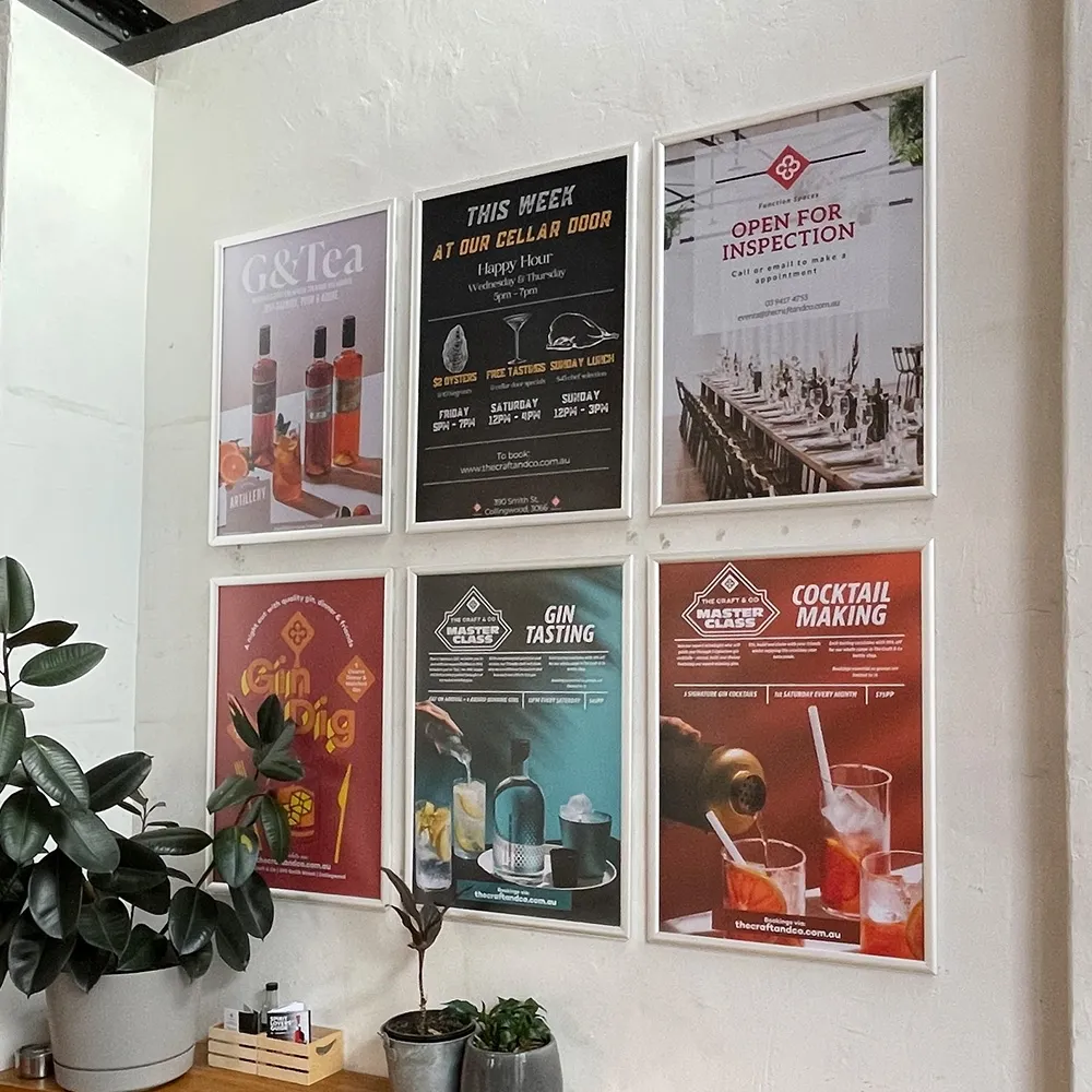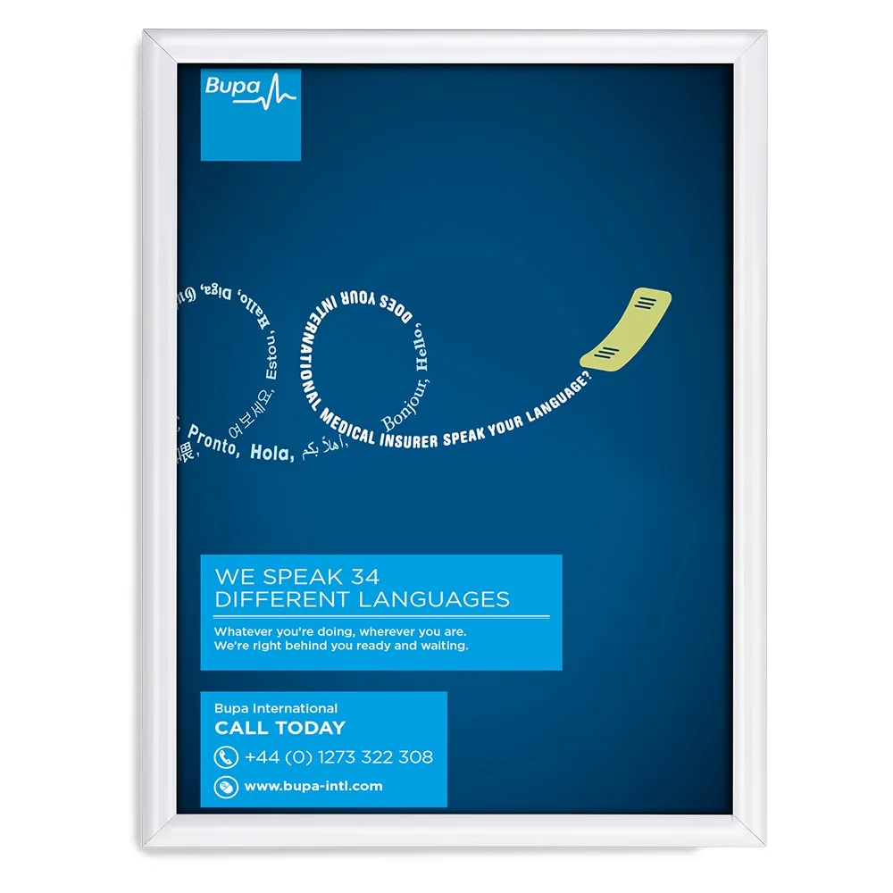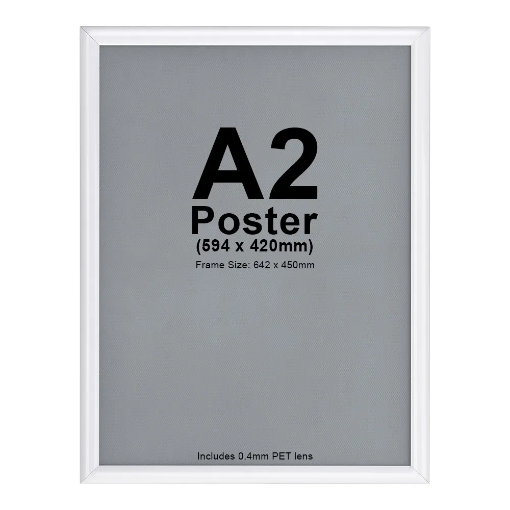 • White poster frame displays an A2 (420 x 594mm) poster in portrait or landscape!