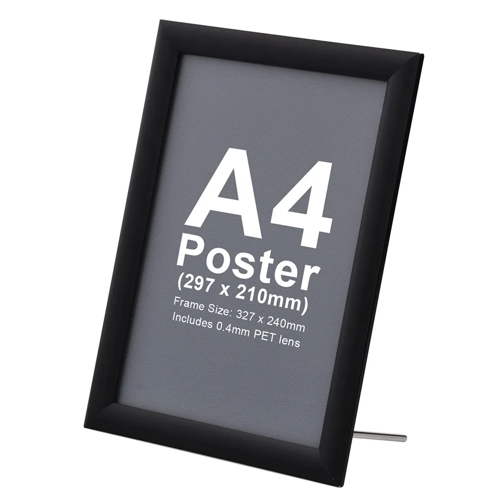 This black snapframe, snap together picture frame makes changing out graphics at your location quick and easy. The simple to use clip frame design requires no tools to switch posters out in less than a minute, ideal for use in fast paced retail environments. The holder is designed to display an A4 (210 x 297mm) poster in either landscape or portrait orientation. Whether used in cafes, restaurants, retail stores, shopping centres, transport stations or exhibition halls, this durable unit is a great way to convey information to vistors.