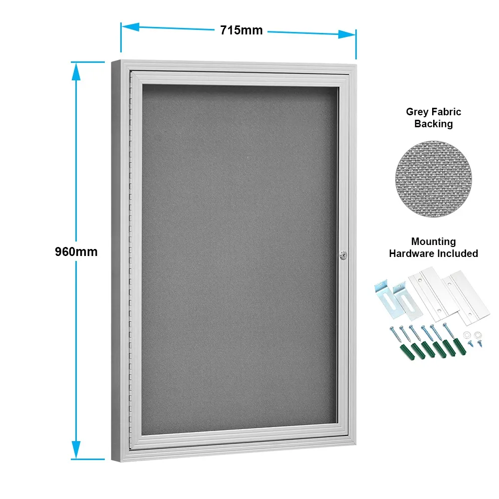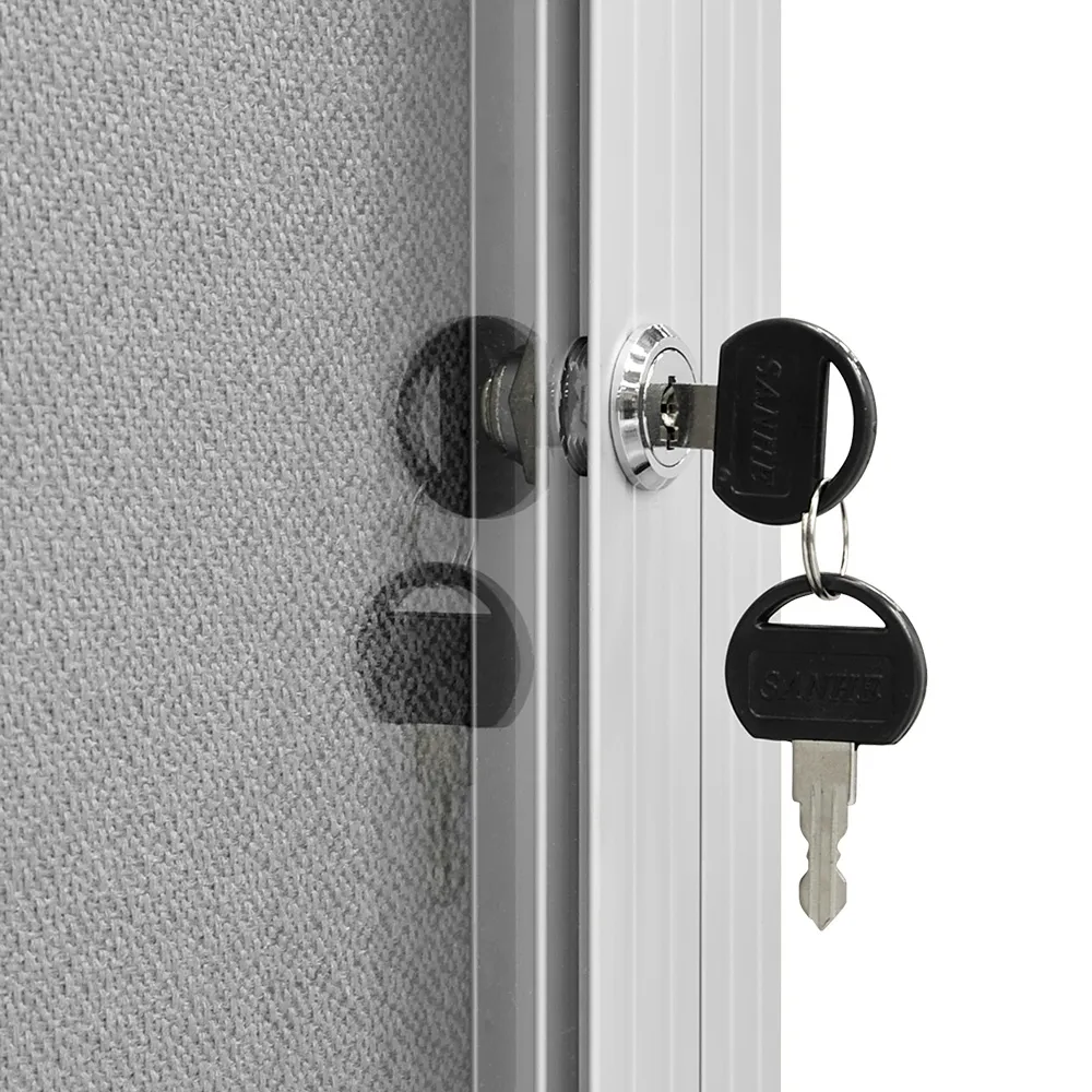This pinboard, bulletin board has a large, 815 x 640mm self-healing corkboard surface that provides plenty of space for displaying your posters, memos, graphics, and other announcements. There is a light grey fabric over this corkboard that provides an attractive alternative to some other styles of boards. The swing door is lockable, allowing you to use this display in a public area with little worry of tampering of case contents!