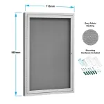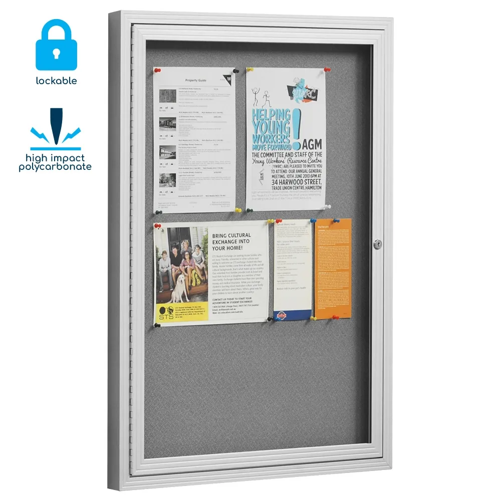 This bulletin board has a high impact polycarbonate door, providing a shatter resistant face to the display that is durable for use in any location. Office notice boards are used in many locations for displaying items in a display manner at universities, museums, lobbies, community centres, exhibition halls, schools, information centres, and transit stations.