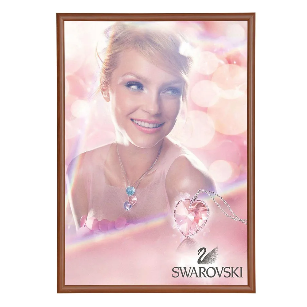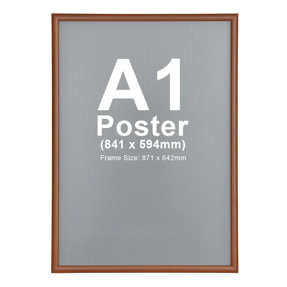 This large A1 snap frame poster holder, or picture frame, has the timeless look of timber. This is achieved through a patented heat treating process that transfers the wooden finish on to the aluminium construction of the frame. The result is a durable and realistic timber finish with the quick and easy poster changes allowed by simply snapping open the clip frame.