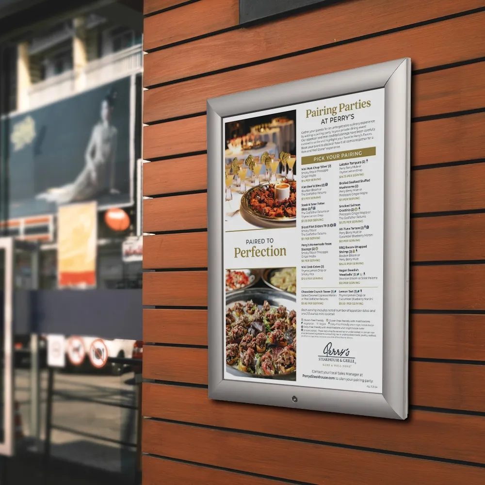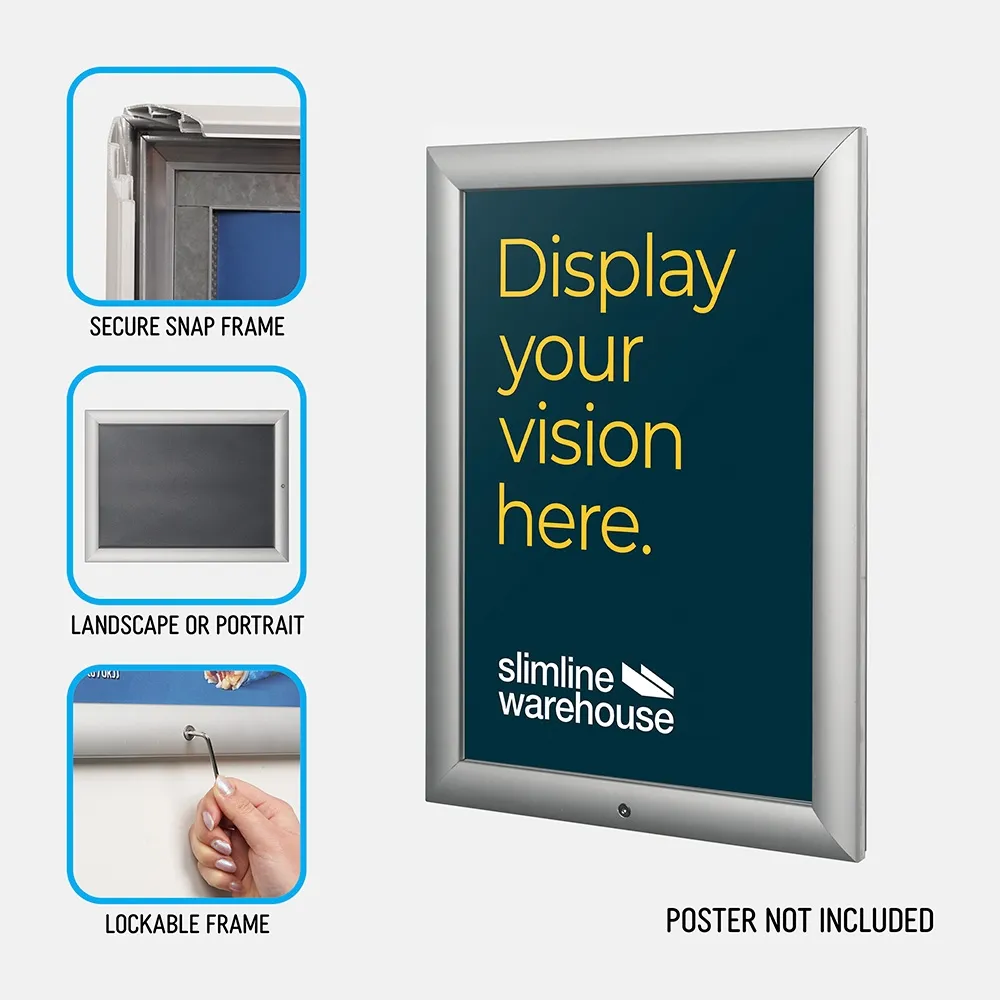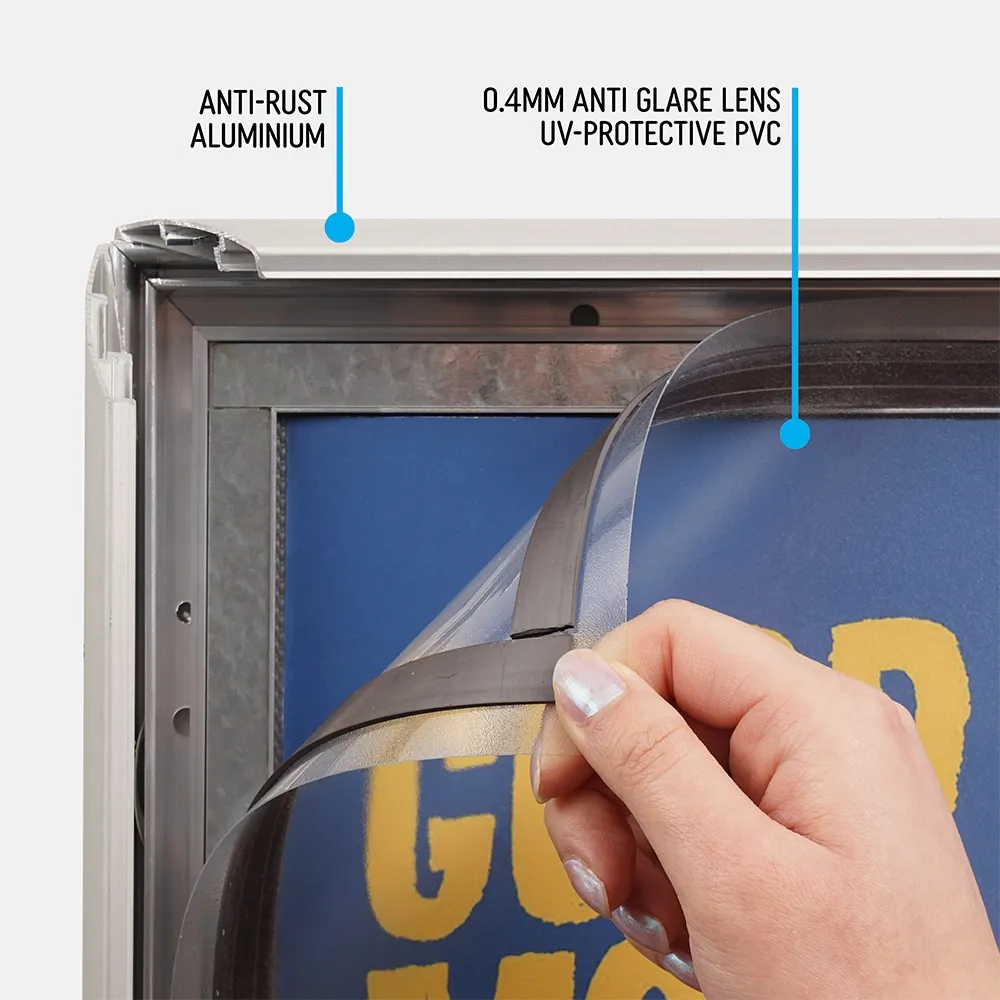 The secure snap frame mechanism creates a lockable outdoor signage solution that stops unauthorised poster changes and reduces maintenance. As an A3 silver anti glare waterproof poster holder, it keeps printed material protected during rain and daily cleaning. This makes it suitable for shopping centres, cafés, pharmacies, job sites and public buildings where visibility and security are essential.