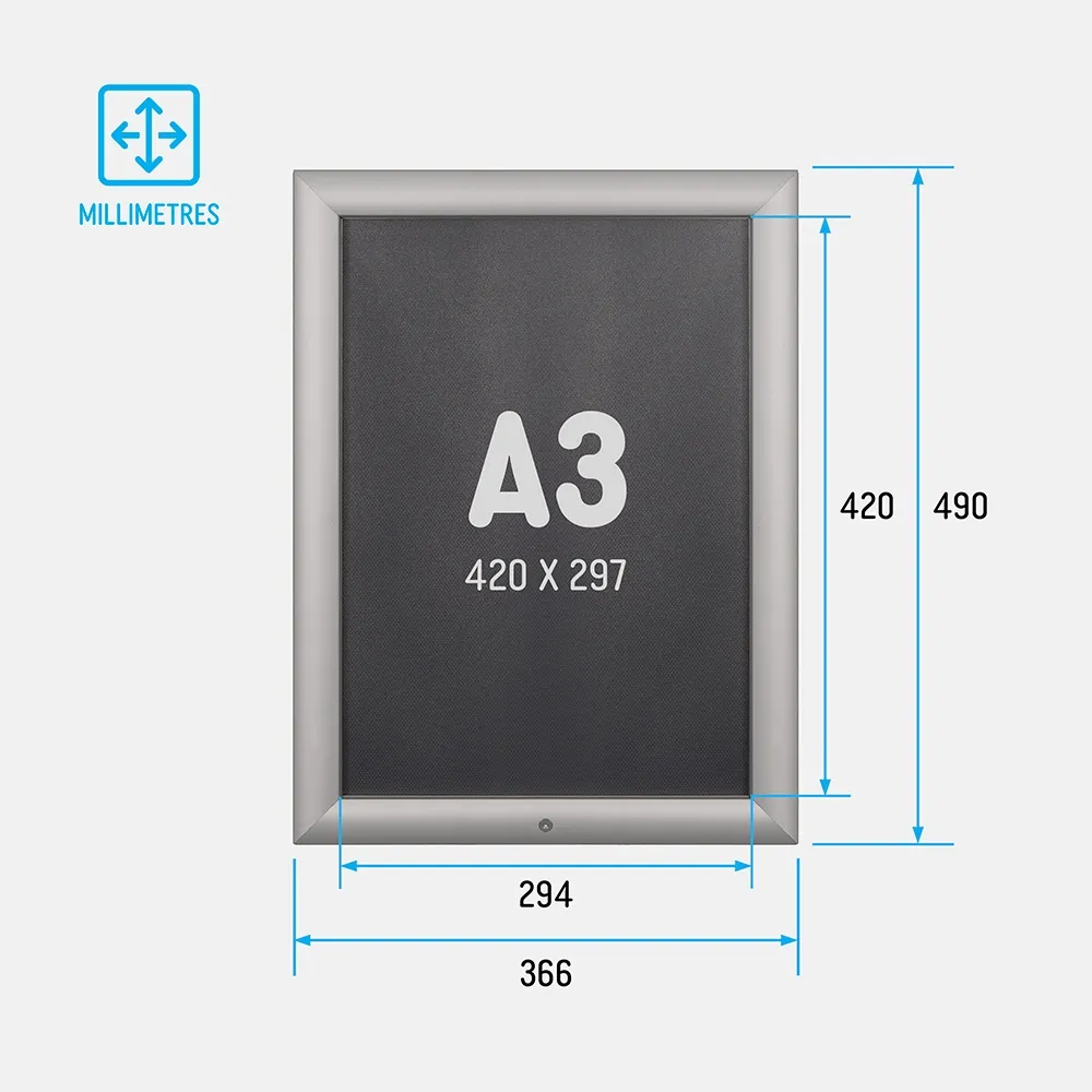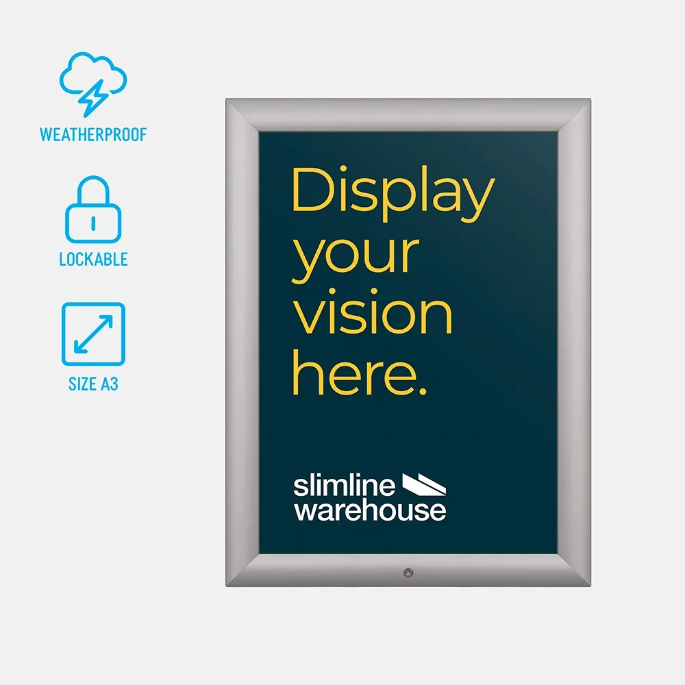 - Outdoor-ready A3 silver UV protective frame with rust-resistant aluminium