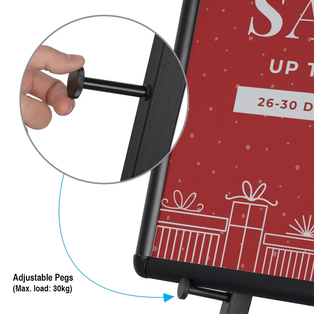 The easel with frame, like many adjustable easels, has a floor standing tripod that the poster holder stands upon. These easels have an adjustable design, with (5) set spots 25cm apart that allow you to position the frame between 4cm and 104cm from the ground to be best positioned for your visitors. The screw in pegs have raised heads at the end that prevent posters from sliding off as well. This stand features a collapsible design as well, allowing it to be stored in smaller areas or make transporting to events easy. There are small hooks that go over the feet to help with the stability of the stand once assembled.