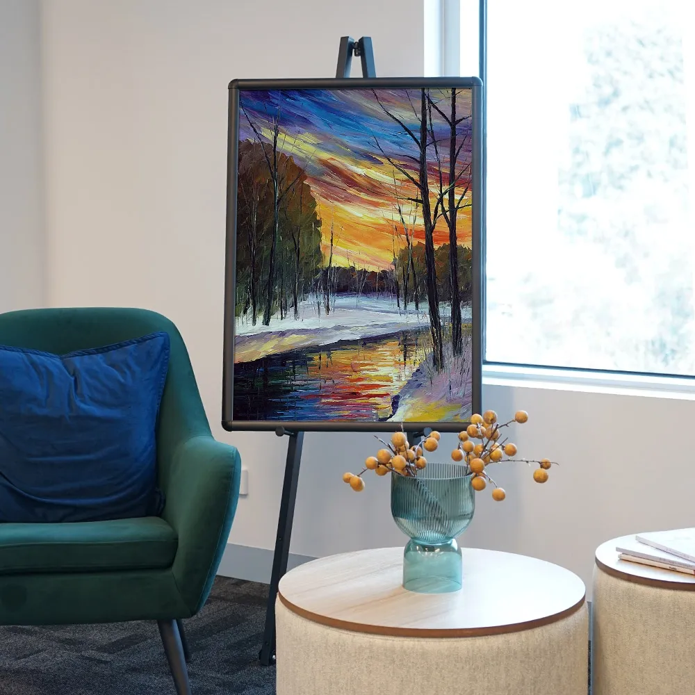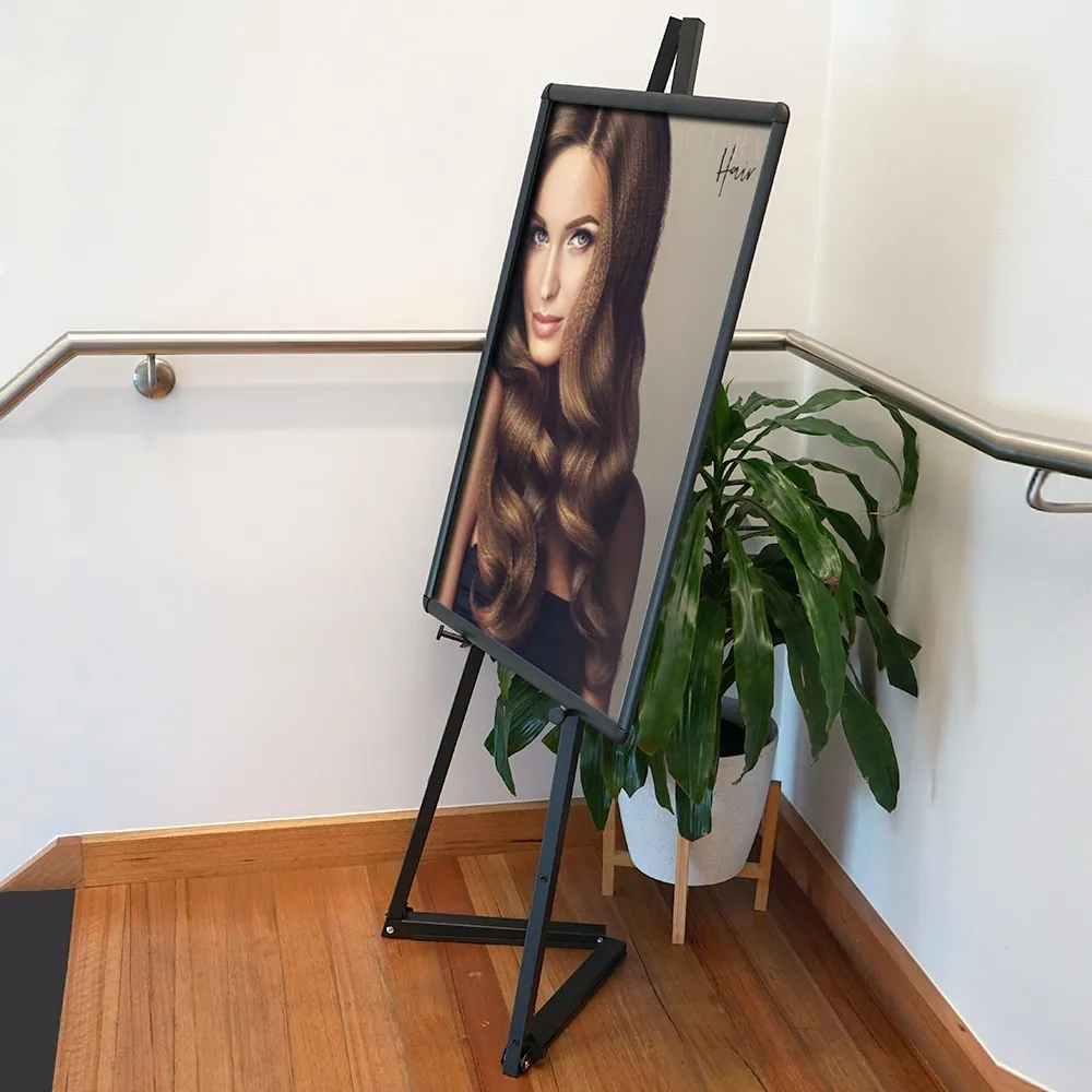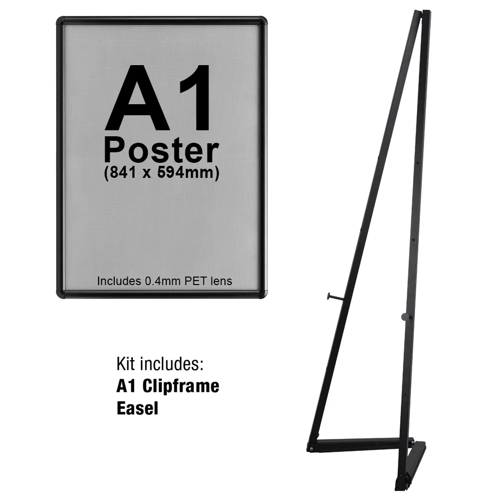 This easel with frame is a full kit that makes having posters on display in any location simple. The poster frame with stand includes an A1 (594 x 841mm) black snap frame that can have posters in portrait or landscape orientation. Clip frames make changing out posters quick and easy with no tools necessary and have a protective lens to keep your poster free of grime and dust. The black poster frame has rounded edges as well as a safety measure, ideal for use in public spaces like hotels, casinos, museums, hostels, information centres, restaurants, cafes, and more.