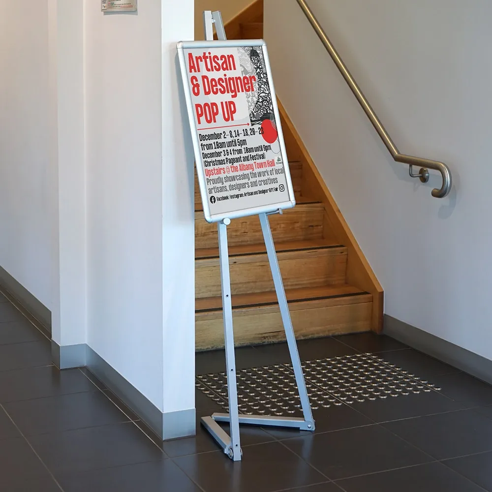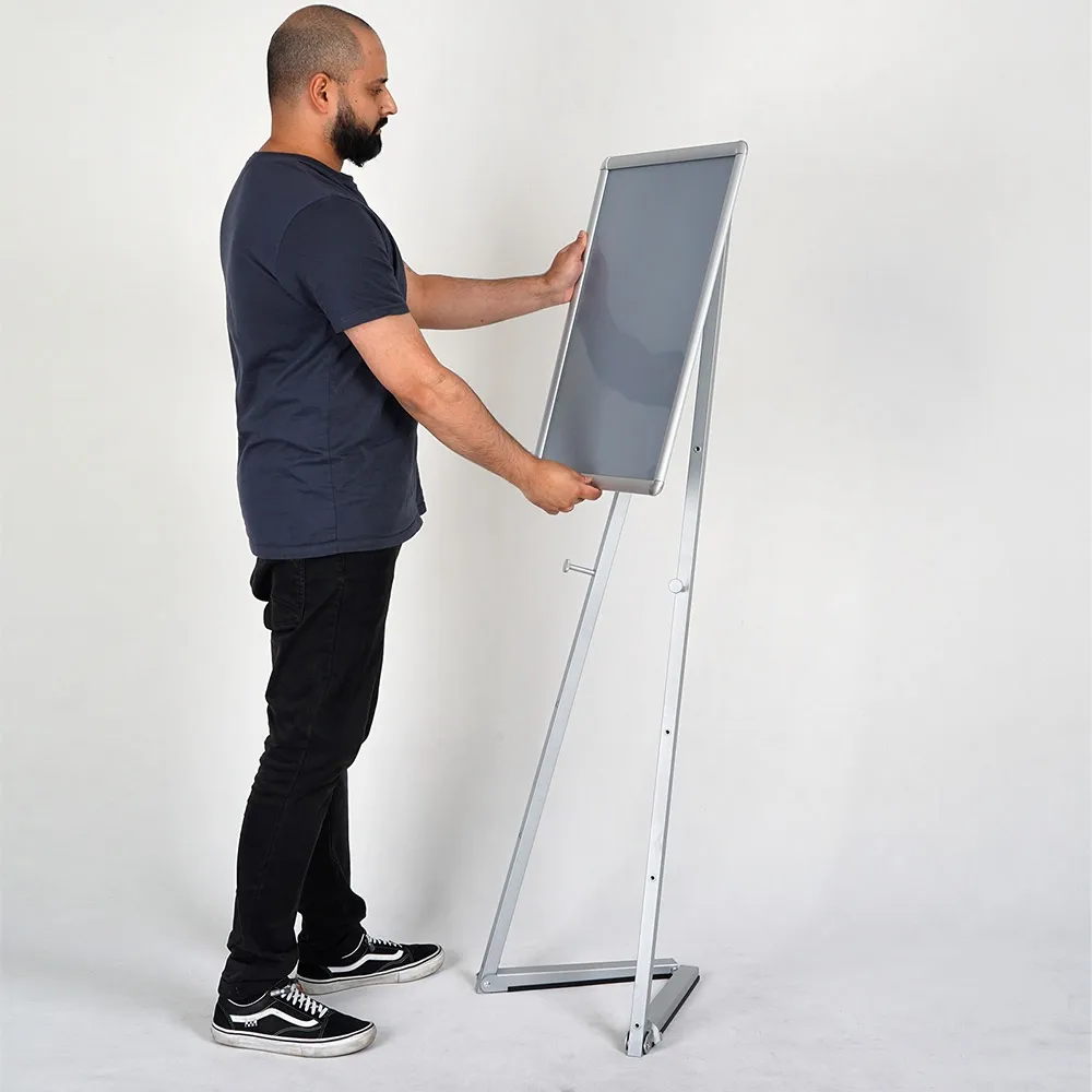 This easel and frame is a useful promotional unit for many locations, whether welcoming attendees at hotels and exhibition halls, displaying menus in cafe and restaurants, providing information in hospitals or universities, or simply displaying promotional materials in stores. The poster frame stand use an A2 (594 x 420mm) silver snap frame to hold graphics, with either portrait or landscape orientation options possible to best suit your needs. Clip frames are easy to quickly change out and include a protective lens that helps to deter vandalism and prevents grime and dust buildup onto the poster. Rounded corners on the clip frame offer a safe display for use in public areas without worry.
