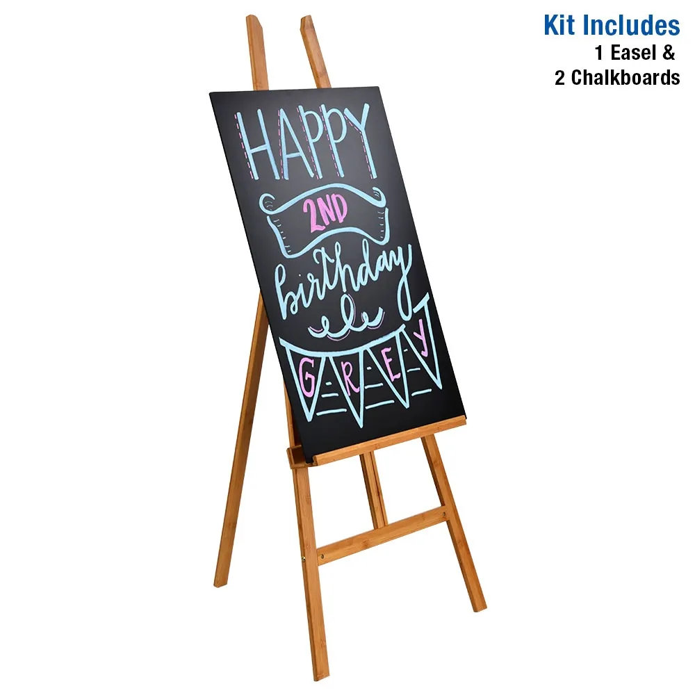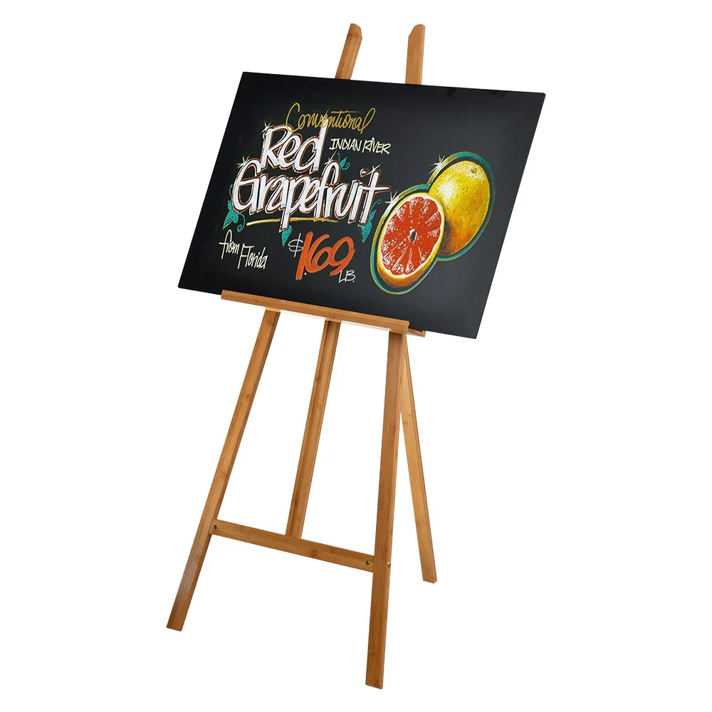 The floor standing menu board, blackboard with easel includes a wooden easel made of premium bamboo with a natural finish, offering style and durability for your business. The A-frame design of the stand is easily set-up, with a hinge on the back leg allowing you to angle the display for best view by visitors as they enter your premises. A wing-nut on the back leg makes it easy to secure the leg in place at your desired angle using no tools.