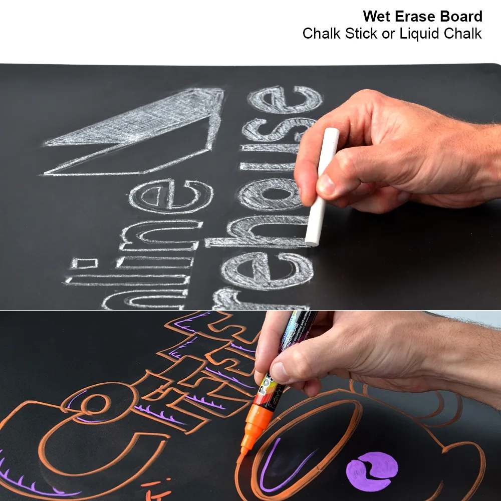- Use liquid chalk markers or chalk sticks on surface & wipe clean with damp cloth