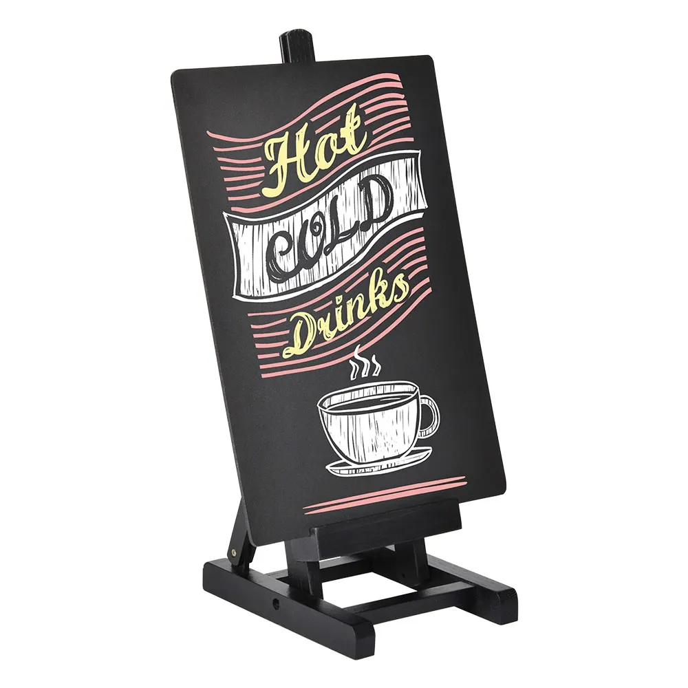 A chalkboard with easel, like hospitality displays, is great for use in restaurants, cafes, bakeries, coffee shops, retail stores, and other locations that feature counter top merchandising. The easel is made from wood and has a black finish with gold hardware to complement the write on board and fit in with any décor. The stand is 350mm tall, designed for countertop use. With a 135 x 162mm footprint, this display is great for promotions without taking up too much space.