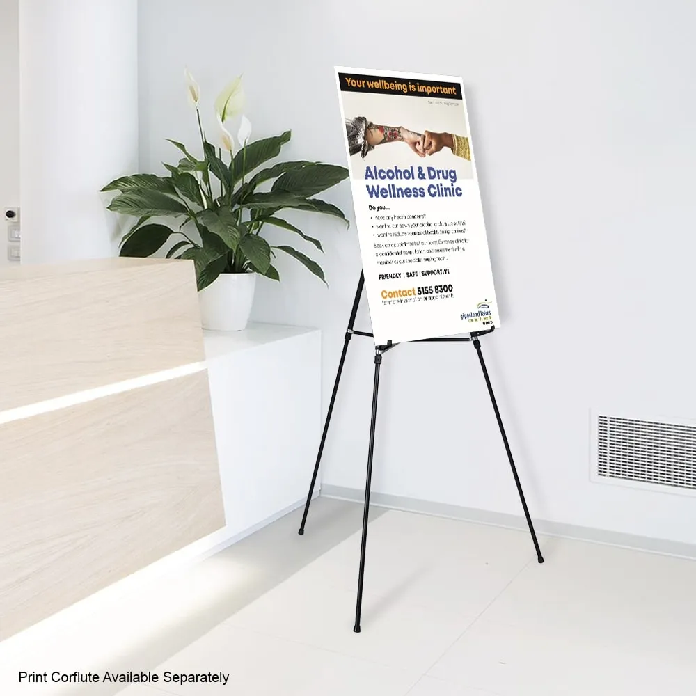 The tripod easels are made from aluminium to not only provide a durable display for consistent use, but make it easier to carry since it only weighs 1kg! Rubber feet on the base of each leg help stop the display from sliding out of place while also preventing damage to floors. The matte black finish is a sleek look that provides a professional display that fits in well with all locations. Slimline Warehouse has same day shipping to anywhere in Australia with this and most other in stock products when purchased by 3pm AEST, buy online today for quick dispatch to Sydney, Melbourne, Brisbane, Adelaide, Perth, and anywhere else nationwide!