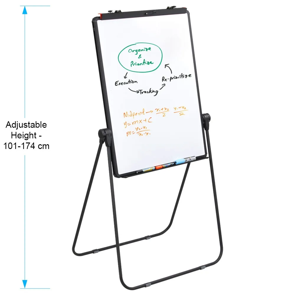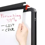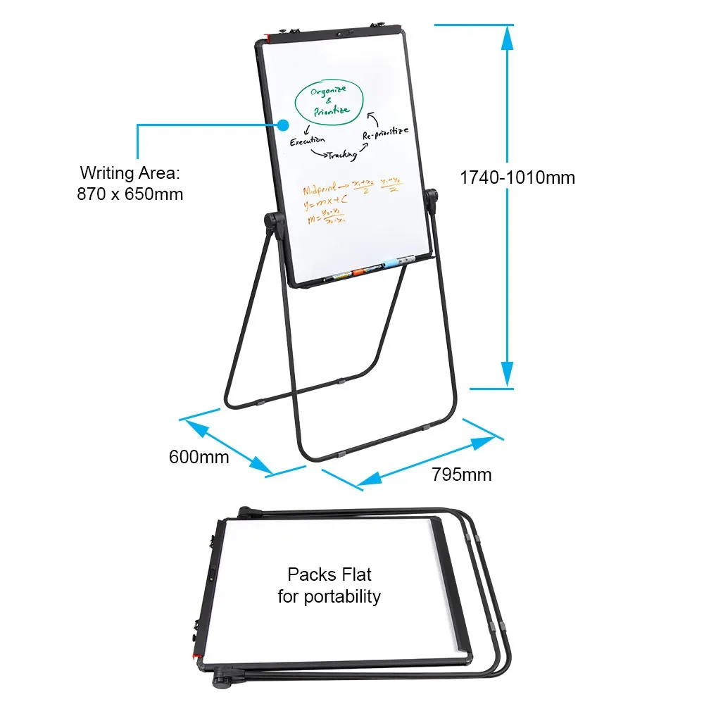 - Pen tray on bottom holds your dry erase markers for quick access and a flip chart holder for attaching a note pad!