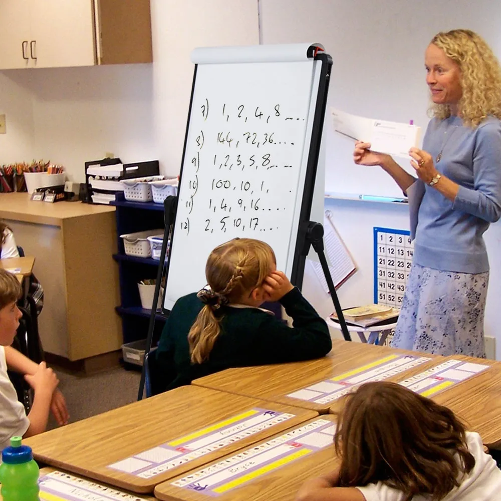 The markerboard features adjustable hinges, making it easy to place the stand onto tables or floors due to their fully rotational design. A rotating knob on the side of the stand makes it easy to adjust the angle the board is displayed at, as well as the height. This dual-sided marker board easily flip to show the otherside of the board save information that needs to be presented again!