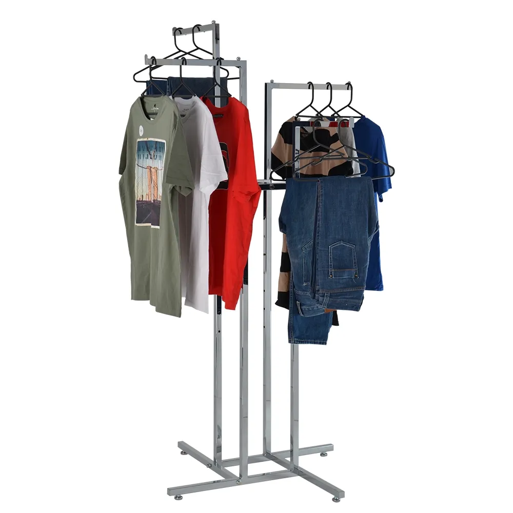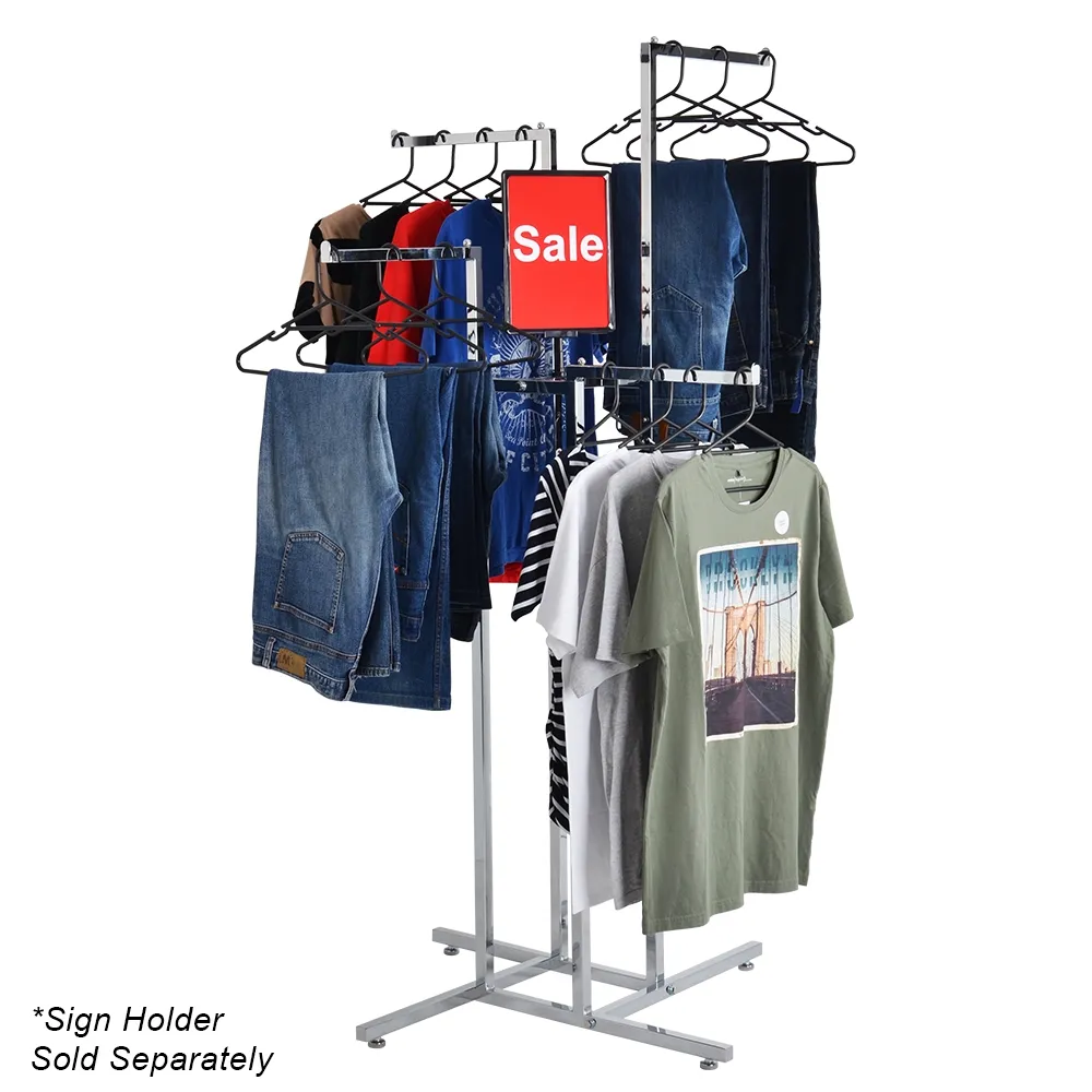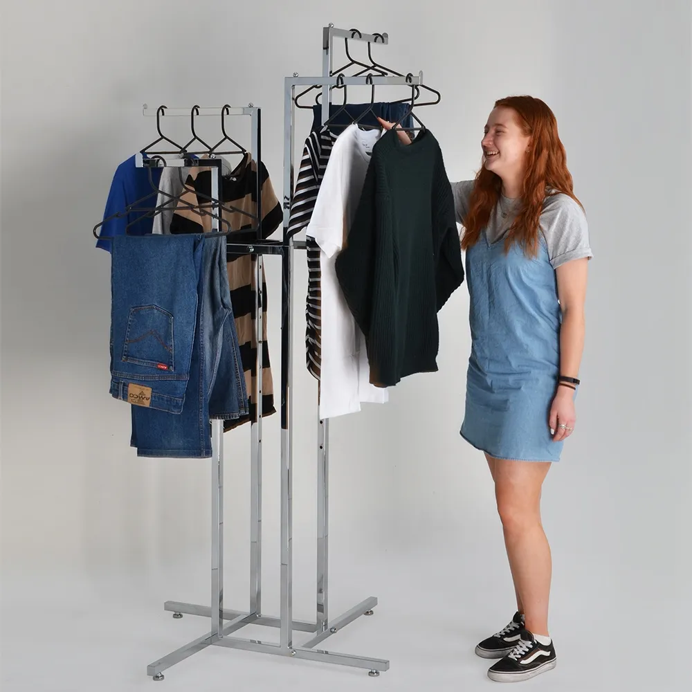This 4 way display rack, one of many available commercial clothing racks, is perfect for shopping centres, retail stores, and more to provide easy to browse merchandise for their customers. There are (4) 365mm long arms on this unit that allows clothes to be hung easily. The arms have a raised lip on one end and a ball on the other to prevent these hangers from slipping off and dropping clothing on the ground. The stoppers don't impede customers from removing items and help to maintain a tidy, professional retail store.