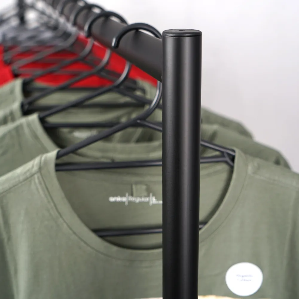 The rolling clothing fixture is made of steel to be lightweight and durable, with a black finish that for a sleek look that fits in well anywhere. Setting up the display is quick and easy with no tools needed, as snap-in poles are utilised for fast assembly in minutes.