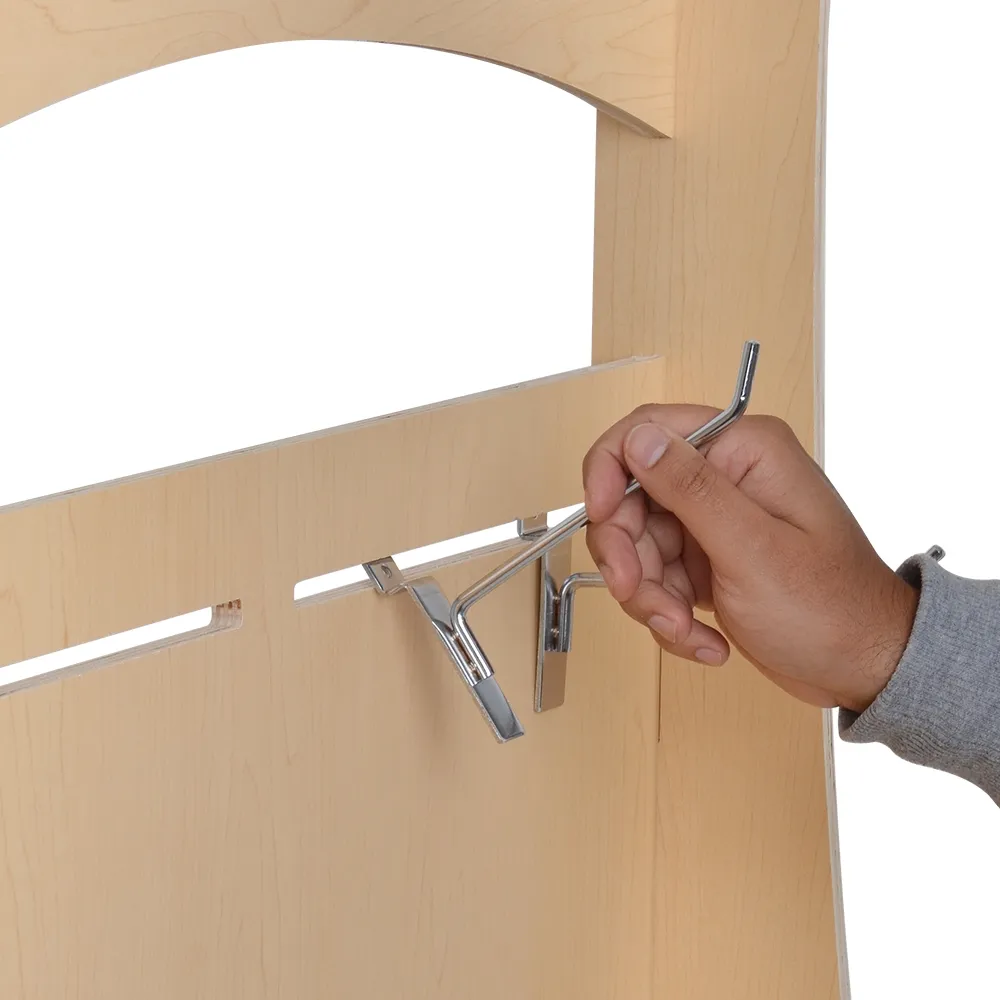• Retail slatwall systems have notches to hang included hooks to merchandise products