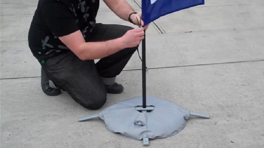 - Included water bag is filled to increase overall stability of the banner