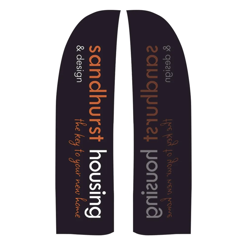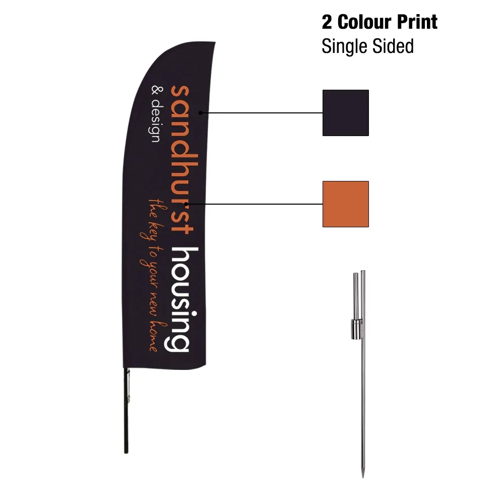 Custom outdoor flags are great for placement outside of businesses in outdoor settings where the 2.3m tall banner is easily seen by potential customers. A metal ground spike is used to provide a stable base that is easily inserted into soft ground. Your custom graphics are printed onto the banner using a silkscreen process with 2 colours possible. The woven polyester flag is printed on one side, with a reverse image on the back to still be visible in multiple directions at once! Screen printed flags are an economical solution for businesses that need to purchase many of the same design for different locations or events. Our in-house team is available for assistance with graphics, with different tier options to choose from to find the design help that best suits your needs.