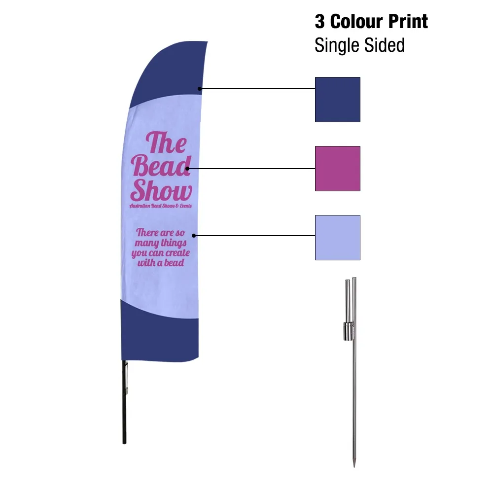 This 2.3 tall custom printed outdoor flags are placed outside of retail stores, shopping centres, outdoor event booths, information centres, and more where it's easily seen by passersby. A ground spike is used to secure the display into soft ground, keeping the banner upright even during light winds or if someone bumps into it! The flag features your custom designs printed in 3 colours, with simple designs creating effective promotions that are highly readable to better communicate with clientele. A screen printing process is used on one-side, with a reverse image on the back to still effectively have a 2-sided flag. Silkscreen printed flags are an economical solution, perfect for businesses needing high quantities of banners for different locations or events. Our in-house team is available for assistance with design, with three tier options to choose from to best suit the needs of your business.
