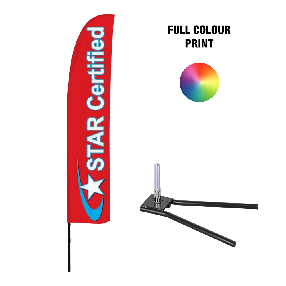 This flying banner features your custom designs digitally printed onto a single-sided flag with a reverse print, or have two flags sewn together to make reading the advertising flags easy. Depending on which style of outdoor event banners your purchase, you will get a different supporting pole, with a heavy duty metal pole to support the weight of dual-sided flags, and a fibreglass pole for the single-sided versions.
