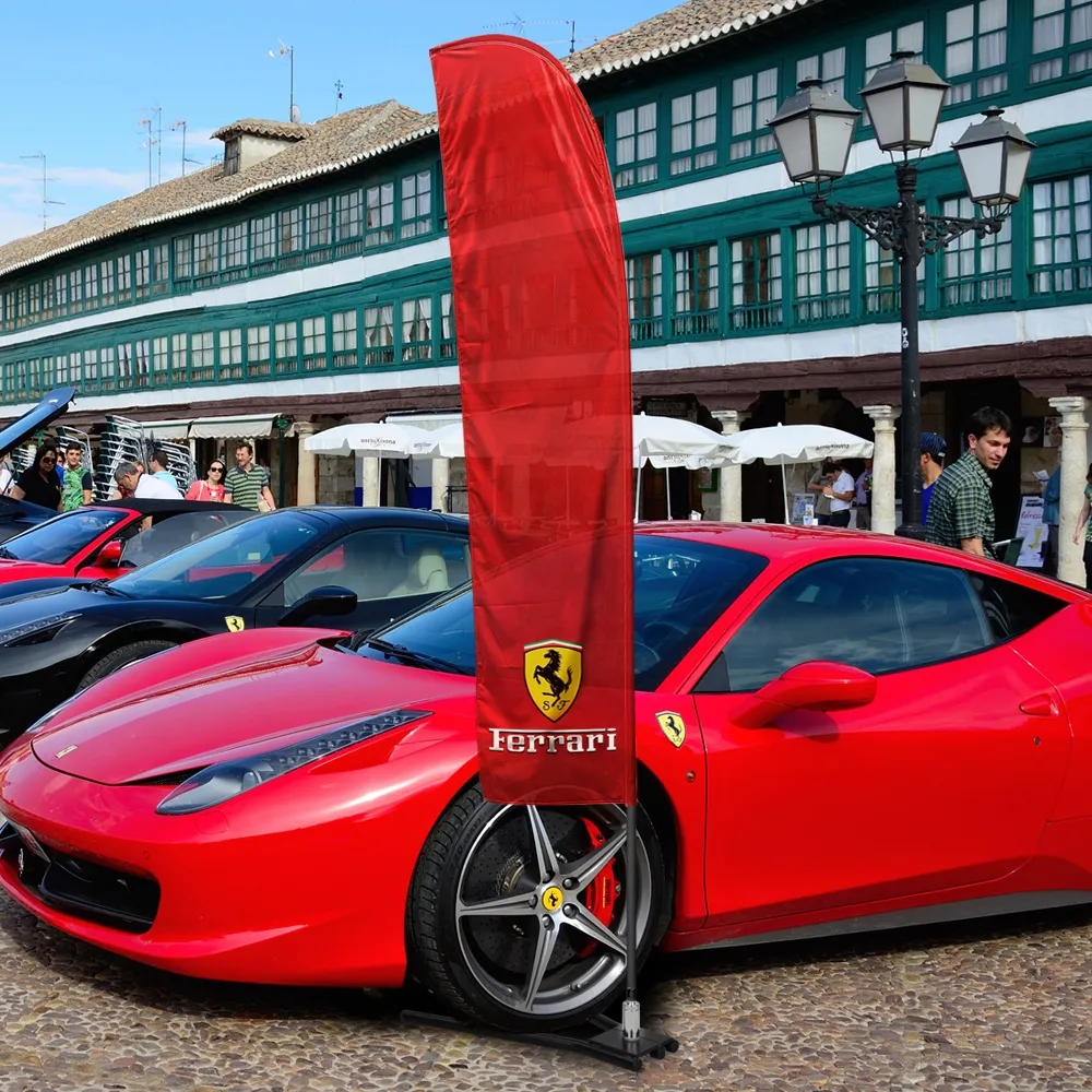 Custom feather flags double sided have your designs digitally printed onto two separate banners using a dye-sublimation process, providing full colour graphics that offer true depictions of graphics to ensure the flags fit your business' needs. Each advertising flag is made from woven polyester for daily use and then sewn together so that the same graphic is facing outwards, unlike the mirror imaging found on many single-sided print options. Use this beach banner for advertising at outdoor events, car dealerships, as well as outside restaurants, cafes, and retail stores!