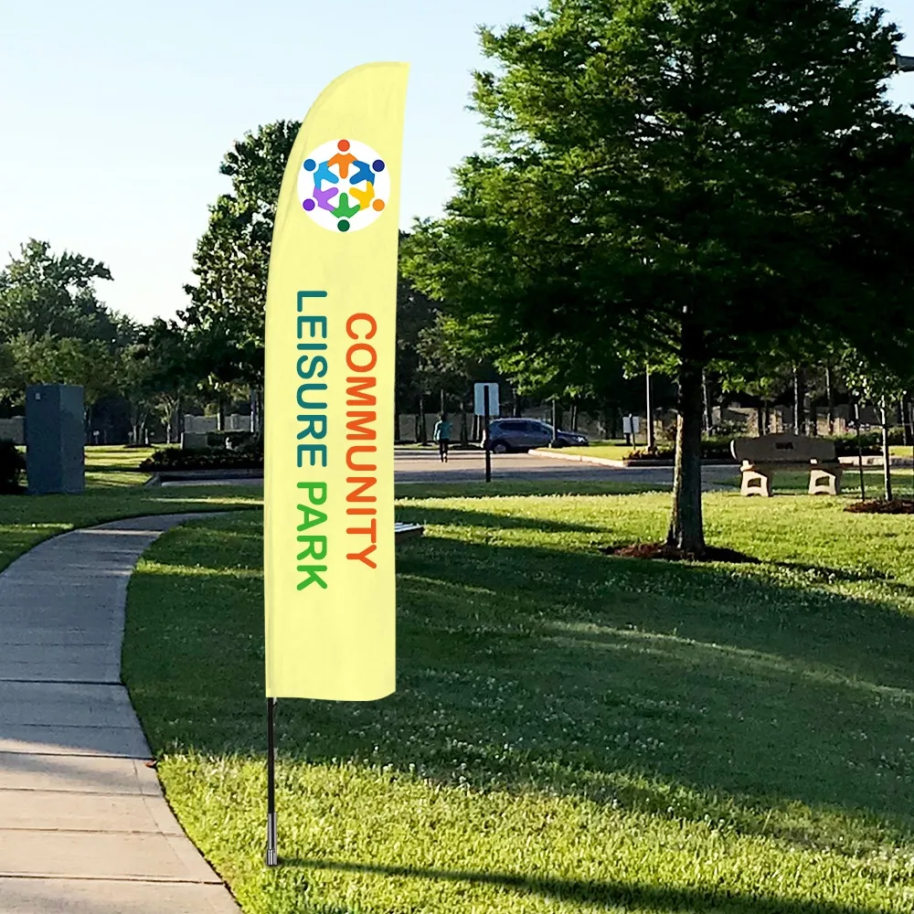 This advertising flag includes a ground spike that is perfect for holding the flagpole at outdoor events, able to easily go into grass or soft ground. The teardrop promotional flags are portable as well, making it easy to bring the flags to different events like outdoor festivals and school functions. The carrying bag holds all the components in place and helps protect the flag from degradation in between uses