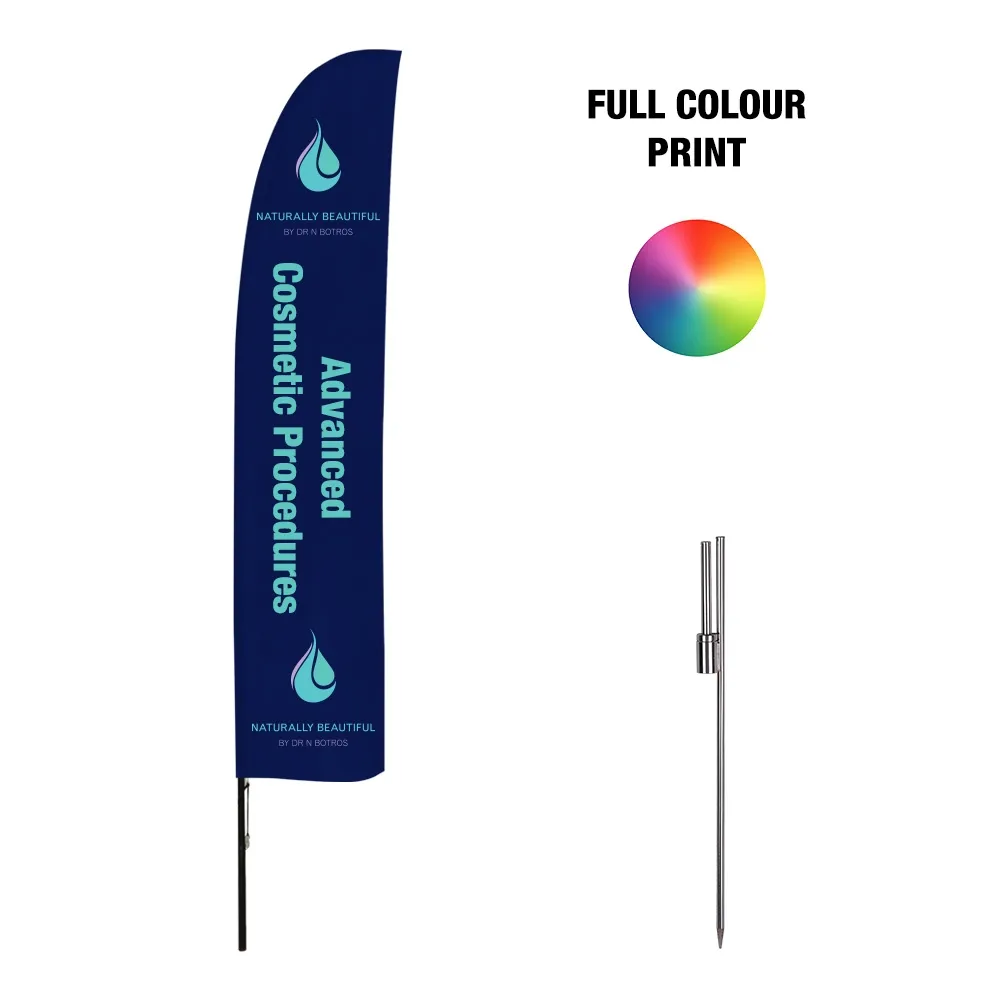 The advertising flag, like outdoor swooper banners, feature a telescoping pole that is made of fibreglass for single-sided print and metal when purchasing a double-sided print flag. Assembly requires no tools and can be done quickly at any location. The polyester woven flags are printed using a digital process that offers a true depiction of your designs in vivid full colour, with a reverse print bleeding through on single sided print. The dual-sided displays actually have two flags sewed together for the true design to be seen!