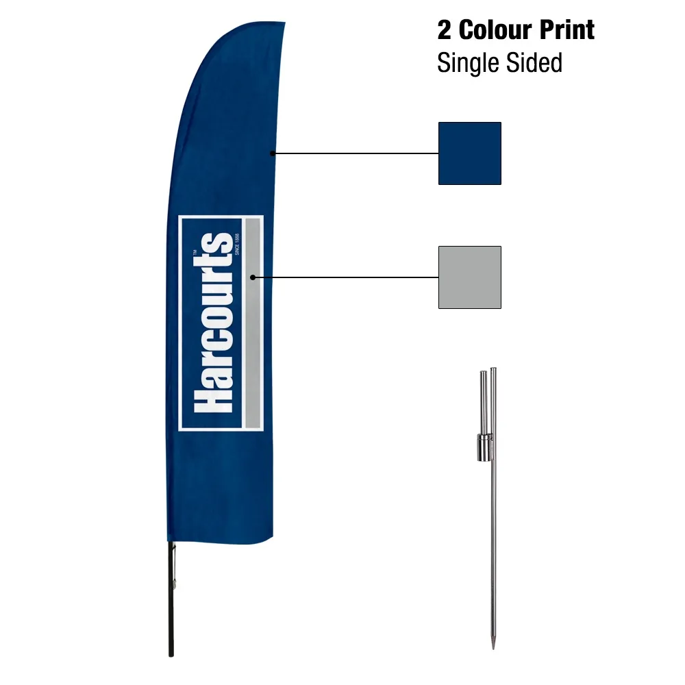 These outdoor advertising flags, like promotional beach banners, has your custom designs printed in 2 colours onto the woven polyester flag. A screen printing process is used that is more economical than other methods, perfect for businesses needing a large quantity for different events or locations. Printing is done on one-side, with a mirror image on the back that is still visible to be seen in multiple directions at once. If you need help with designing the graphics for this flag, our in-house team is available, offering three tiers of help to fulfill the differing needs of every business. A ground spike is used with this banner that is inserted into soft ground and offers a stable base that remains upright even in light winds!