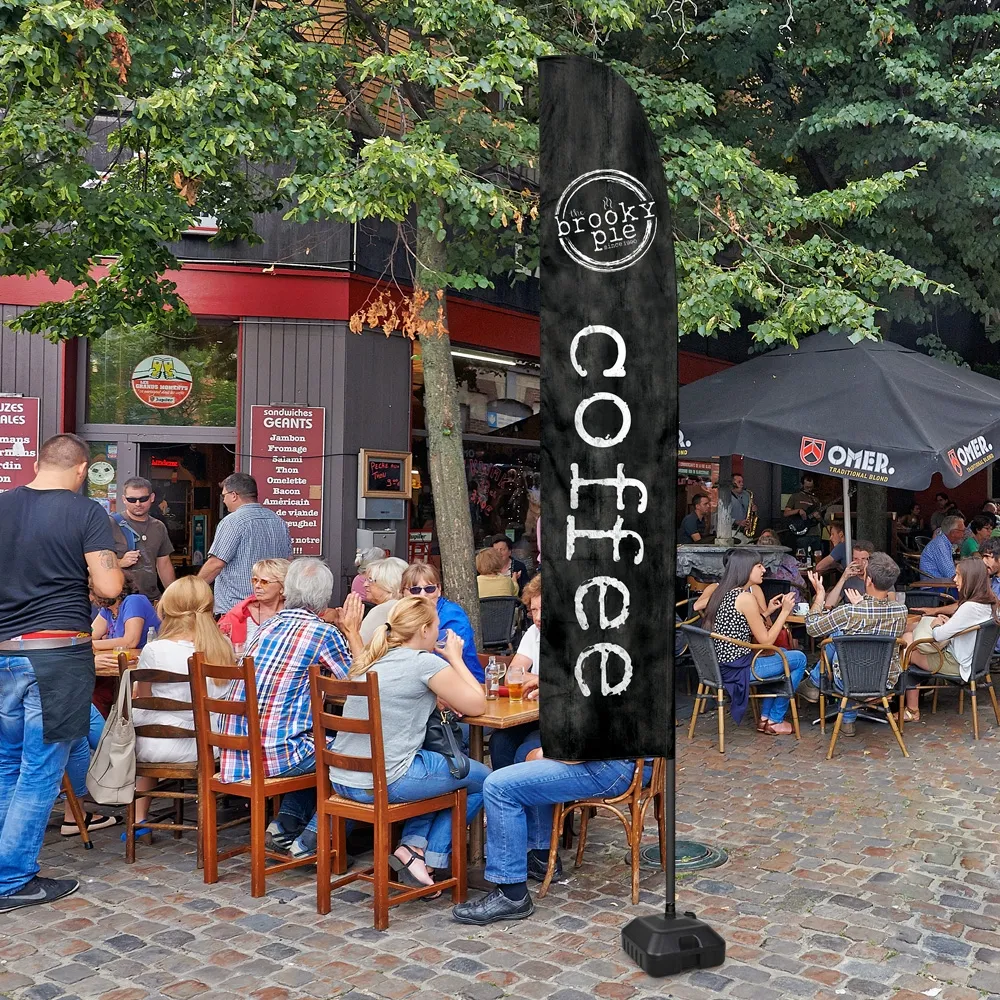 These custom advertising signs, flags banners are portable displays, with a nylon carrying bag to bring the display to and from events with ease. The water base has a built-in handle as well to make picking it up simple. You can fill the outdoor water base with sand or water to provide a stable display that will work well in most wind conditions. The collapsible pole sets up without any tools needed for quick set-up at any location, including restaurants, cafes, exhibition halls, outdoor events, and retail stores!