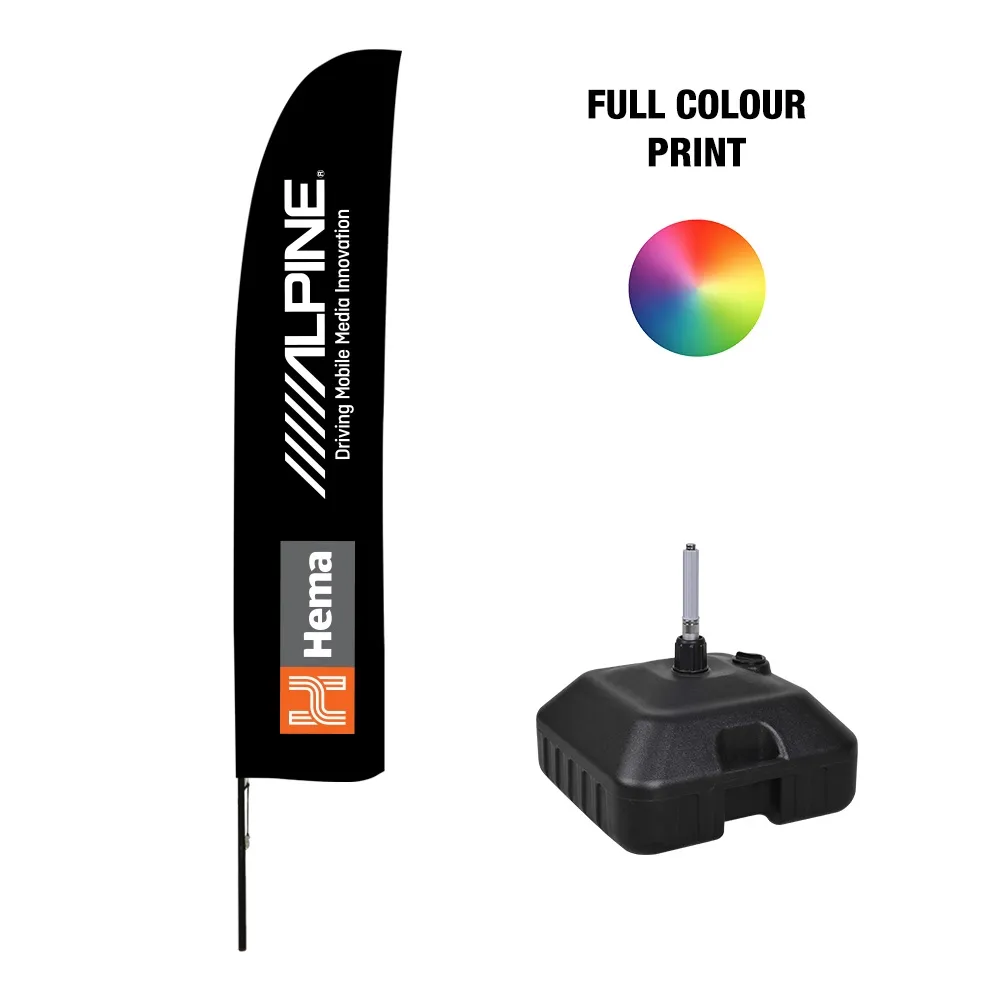 These flag banners show your custom graphics on a 3.3m woven polyester flag that can easily be seen by passersby to your location. The outdoor feather flags have two printing options available to choose from: single-sided with a reverse print on the back, and dual-sided versions that are two flags sewn together. Depending on which flag banners option you purchase, your collapsible pole will be different. The single-sided version has a fibreglass pole, with a more heavy duty metal pole included to support the extra weight of the dual-sided version.