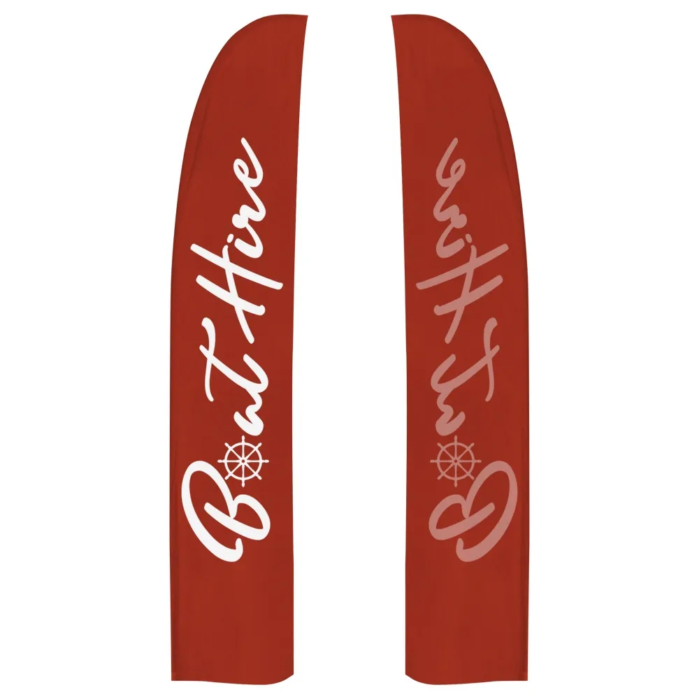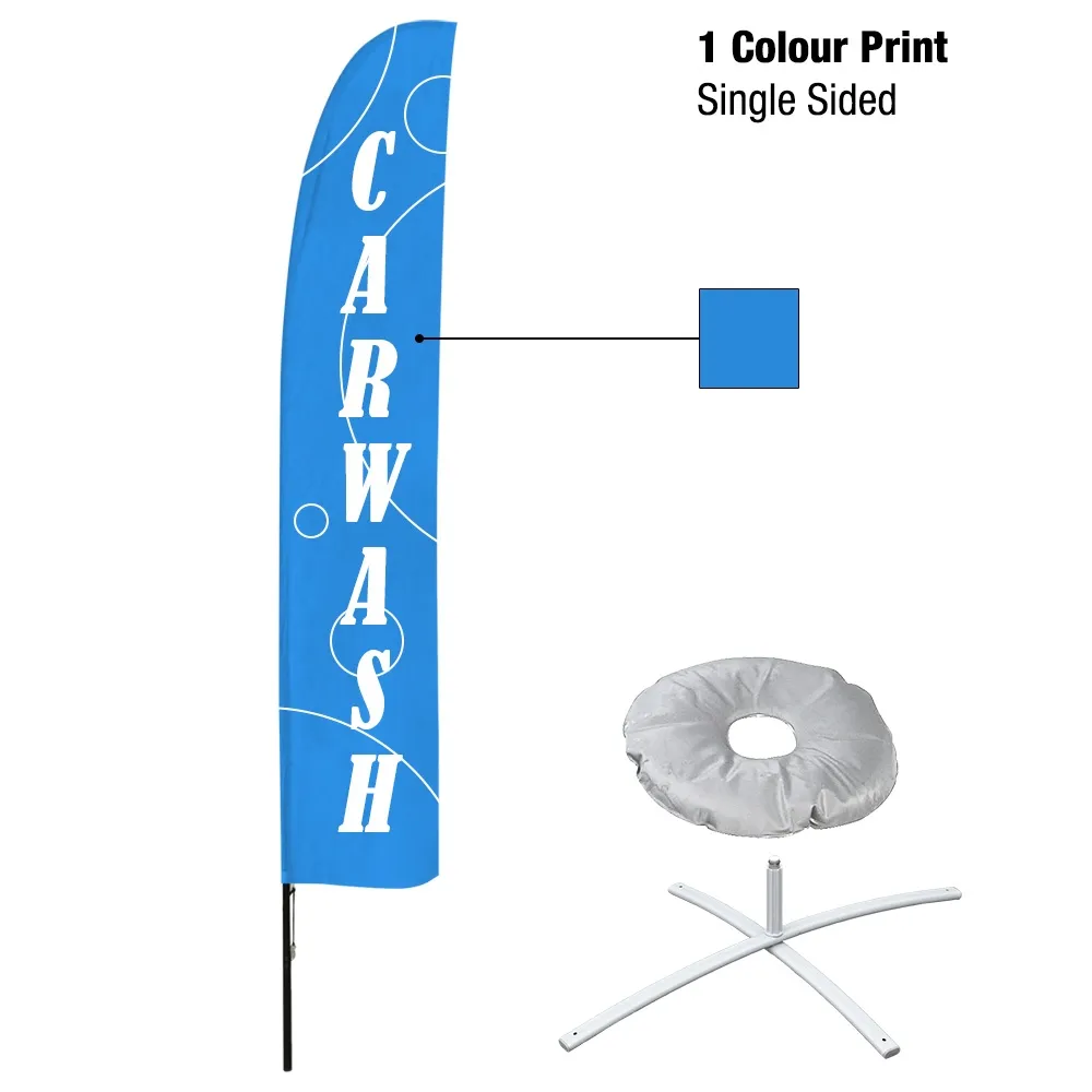 These custom fabric flags, screen printed banners have 1, 2, or 3 colour printing options on a single side of the flag. The printing process used with these flags is budget friendly, and great for businesses that need a large of quantity for their locations. The 3.5m tall display can be seen from across a field or exhibition hall to alert potential customers of your business.