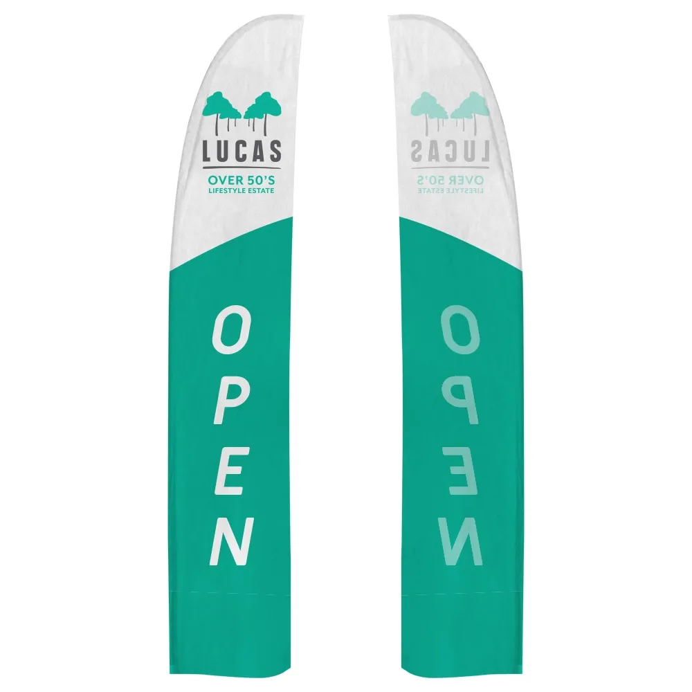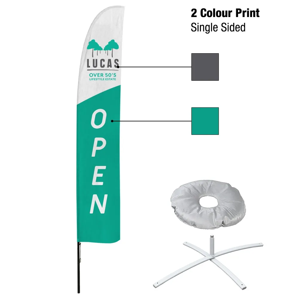 Custom printed feather flags feature your custom designs printed in 2 colours for simple graphics that are easy for passersby to read at shopping centres, museums, information centres, train stations, retail stores, restaurants, and outdoor events! A screen printing process is used that has a reverse print on the back to be visible in multiple directions at once. Screen printing is a more economical way of placing graphics onto the fabric, perfect for businesses or coordinators that need many of the same banners for stores or events! Our in-house team is available for assistance in design, with 3 tier options to choose from to help you meet your needs.