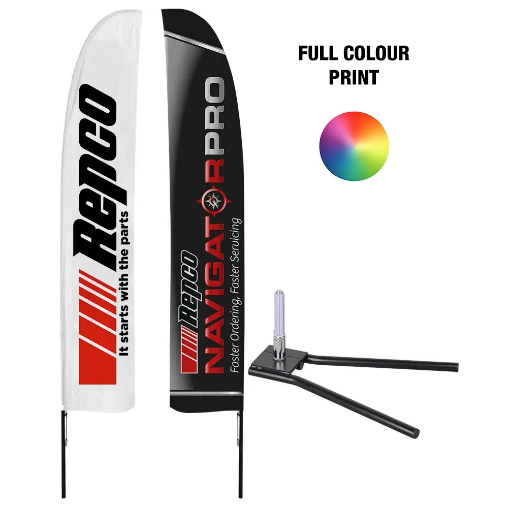 The advertising banner, promotional flag is 3.5m tall for an easy to see banner that is visible across a festival ground and to passersby on streets or at events. A digital printing process is utilised that offers a true depiction of designs in vivid full colour thanks to dye-sublimation. The flag consists of two woven polyester banners sewn together so that there is no reverse image on either side to be best seen by visitors and potential customers. The is actually Each flag is digitally printed onto woven polyester fabric using dye-sublimation for a true depiction of your designs in vivid full colour. Our in-house team of print experts are available for design assistance as well, with different tier options that let you choose the right fit for your business!