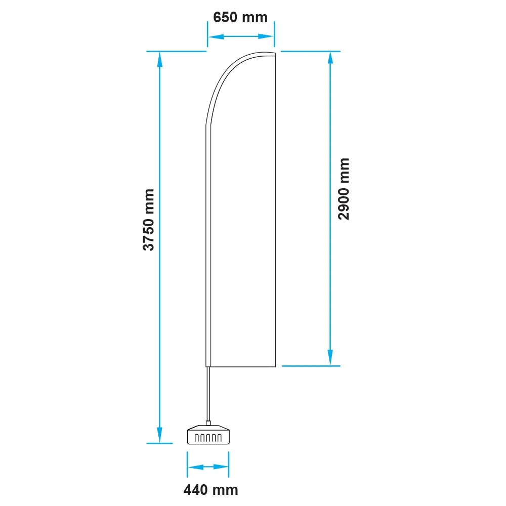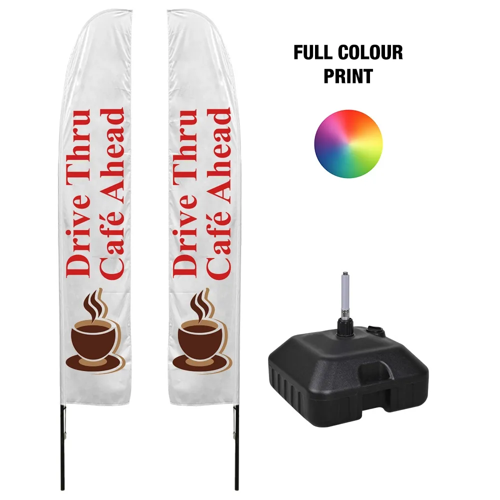 Double sided feather flags are 3.7m tall, an easy to spot advertising display that is an effective way to draw the attention of passersby with ease using vivid, full colour graphics! Custom designs are digitally printed on the woven polyester banner using a dye-sublimation process that offers true portrayals of designs with rich imagery. The dual-sided flag actually uses two individual banners that are sewn together to have the same graphics on each side, unlike single-sided print options that have a mirror image on the back. This banner is great for advertising and marketing outside of restaurants, retail stores, cafes, car dealerships, universities, and around outdoor festivals!s