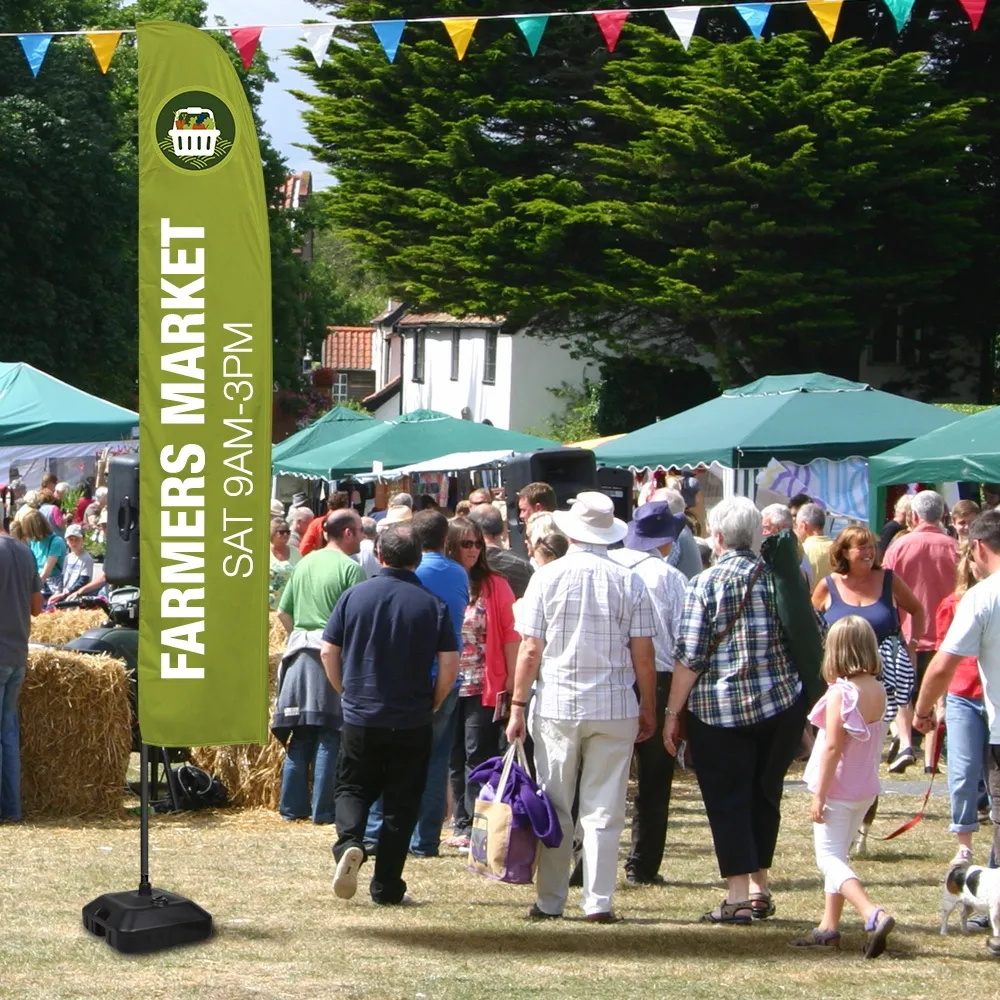 - Double sided feather flags have fillable water base for added stability on any surface!