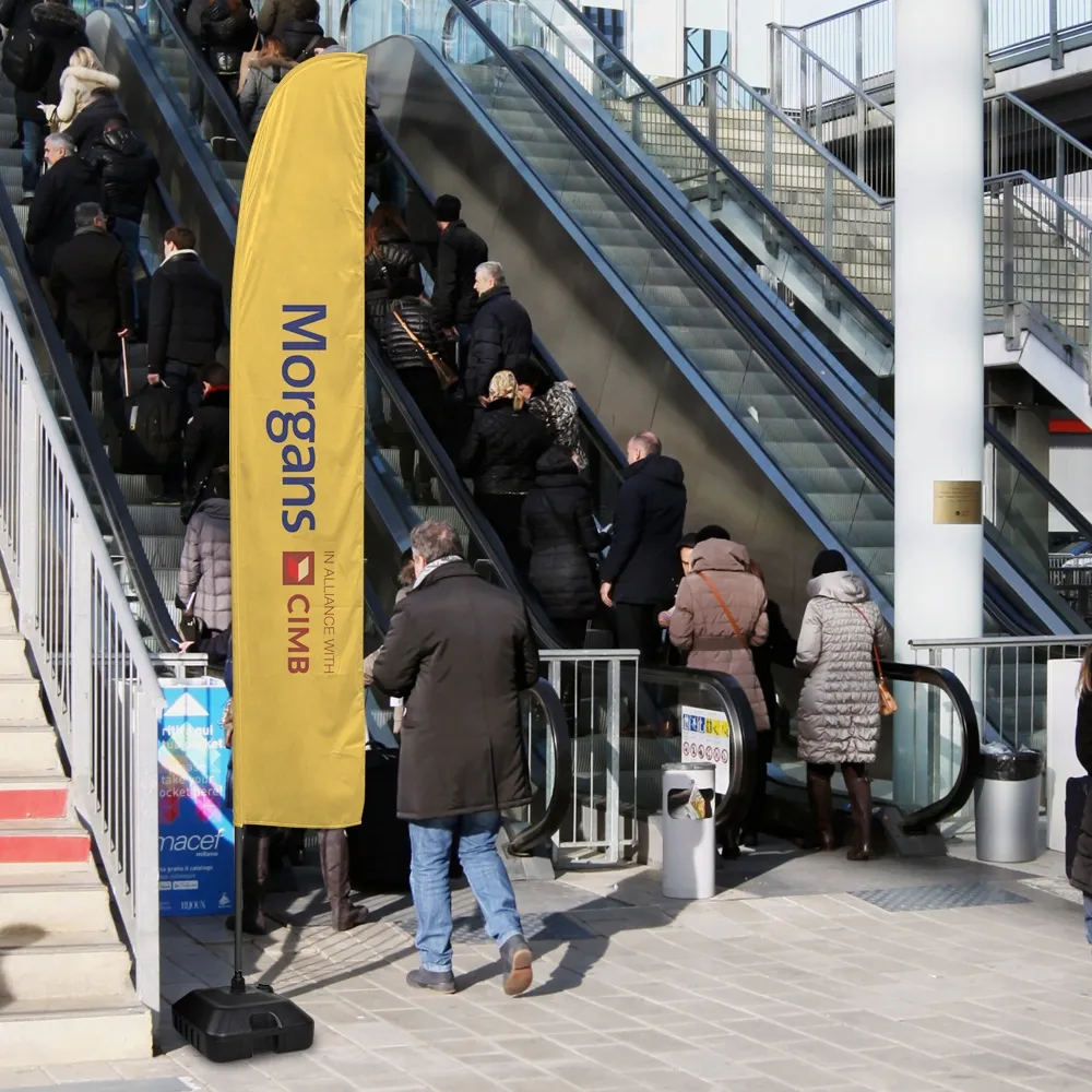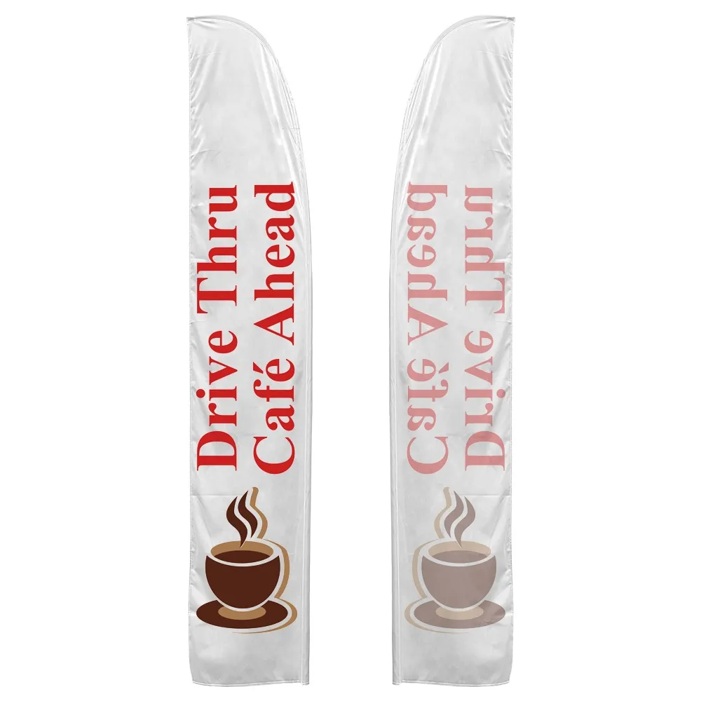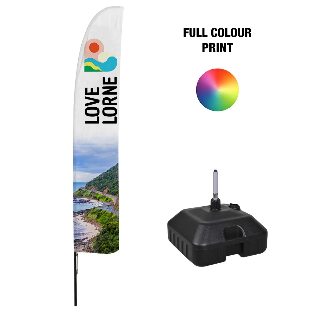 Promotional flags are an effective way to get the attention of potential customers, using a 3.7m tall banner with vivid colours. The blade flags are digitally printed using a dye-sublimation process that stays true to your custom designs. There are two printing options to choose from onto woven polyester fabric: single-sided with a reverse print, and dual-sided that is two flags sewn together. The marketing banners are great for restaurants, retail stores, cafes, car dealerships, universities, and around outdoor events!