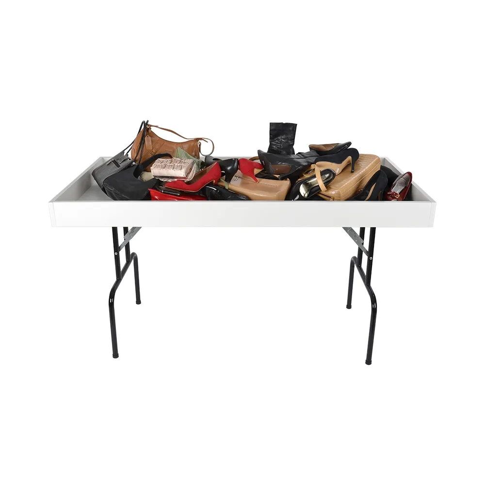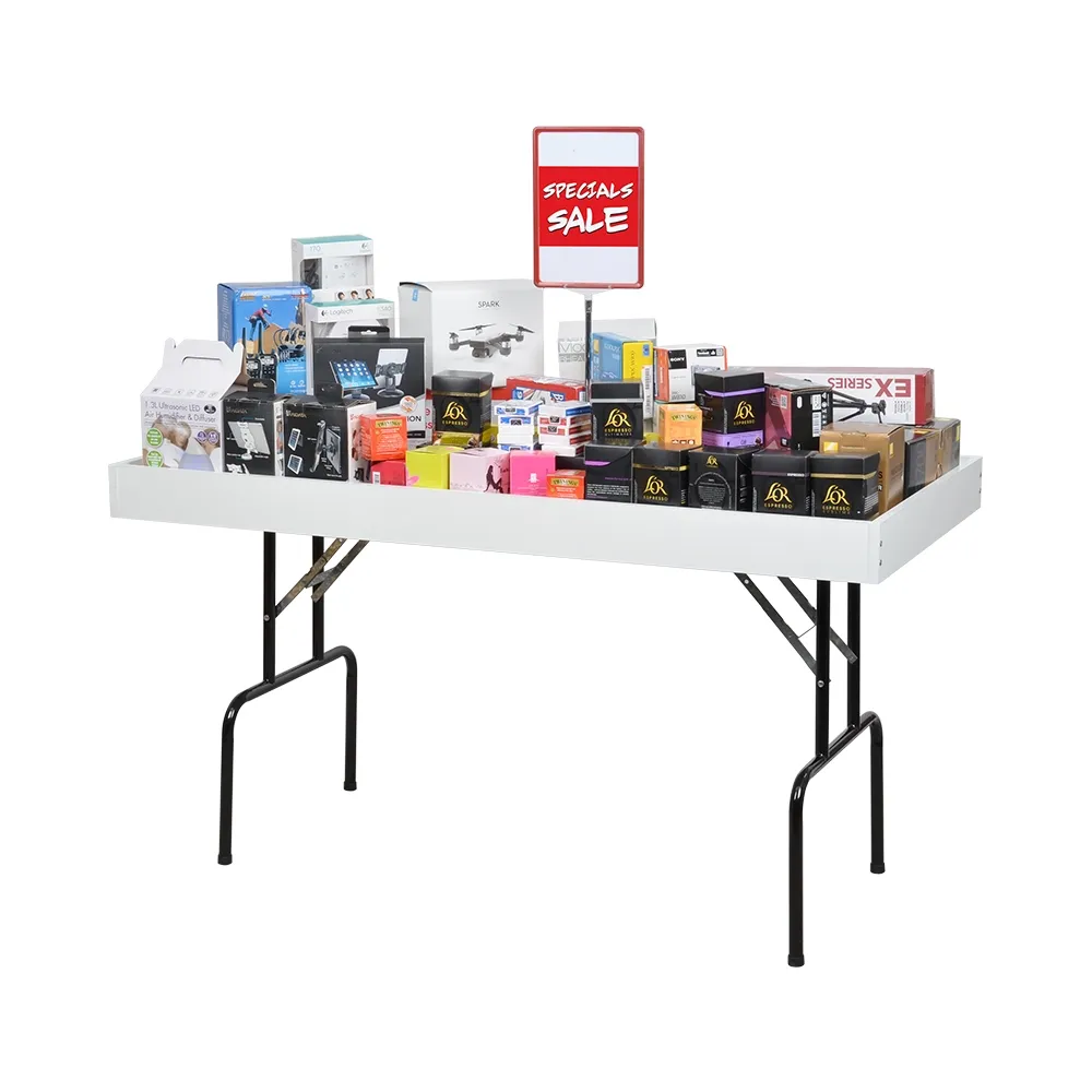 This folding dump table, one of many store fixtures we offer, makes displaying a variety of merchandise on your sales floor easy and convenient. The display is 840mm tall, standard height for retail displays to allow customers of any height to easily check out your products. This merchandising table is perfect for use with retail store signs to help highlight available items and sale prices to really entice customers to browse through.