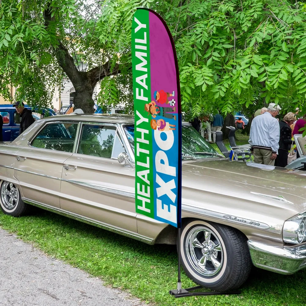 This bow banner features a car base that goes under the wheel of your car, providing a weighted base for use at outdoor events or outside of your business. The advertising banners are easy to set-up with no tools required. A carrying bag is included that holds all flag components and makes transport between events easy for any employee. You can store the advertising swooper flag in the bag in between uses to help prevent dust from gathering or damage whilst in storage!