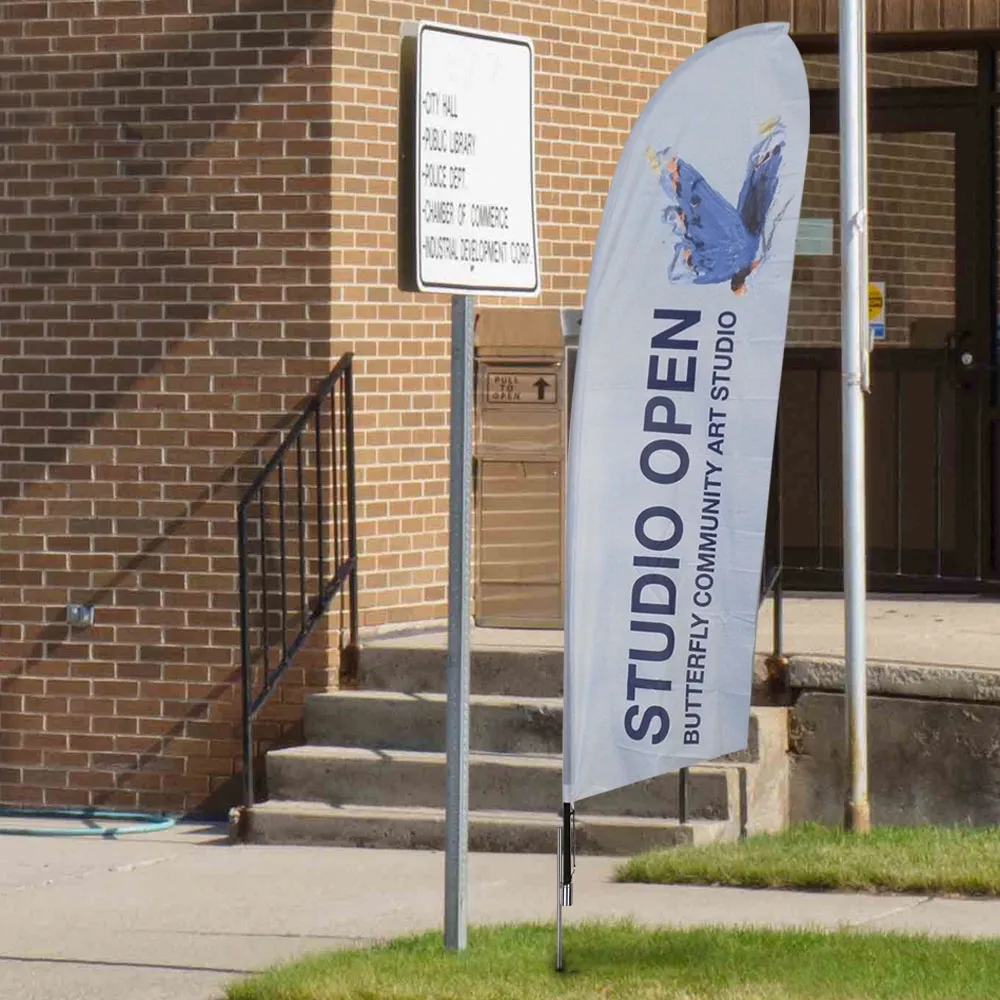 The bow banners are portable displays that have a nylon carrying bag to hold all the components of the kit for bringing the unit to trade shows, outdoor festivals, and can even be stored in between uses at your store or restaurant. Custom bowhead flags have a ground spike for inserting the flagpole into grass or soft ground, securing the flutter banner sign to stay in place and the 2.3m tall flag viewed all directions!