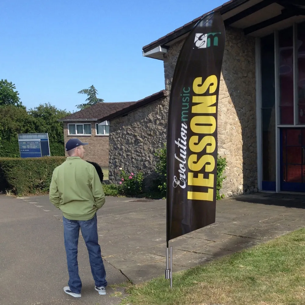 This bow flag is a great way to market outside of your business, with a ground spike included that goes into the grass or soft ground for a stable base that stays in place. This feather banner is 3.3m tall, and uses a telescoping pole that is made from durable fibreglass to hold the flag in place, needing no tools for quick assembly in just a few minutes. This type of bowflag is perfect for placement at outdoor festivals, events in gardens, and even outside shopping centres, car dealerships, and restaurants!