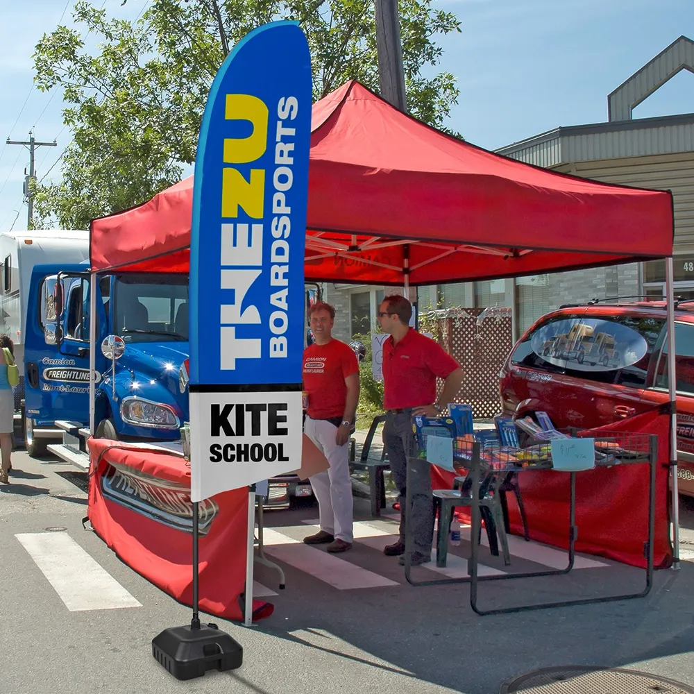 These feather flags have a fillable base that helps provide a stable display for use in different winds and weather. Fill the base with water or sand to weigh it down. The advertising feather banners are portable, with a built-in handle in the base to make carrying it easier. A nylon carrying bag is included as well that also helps to protect the flutter sign in between uses. Assembly is quick and easy due to the collapsible fibreglass pole not requiring any tools for set-up!