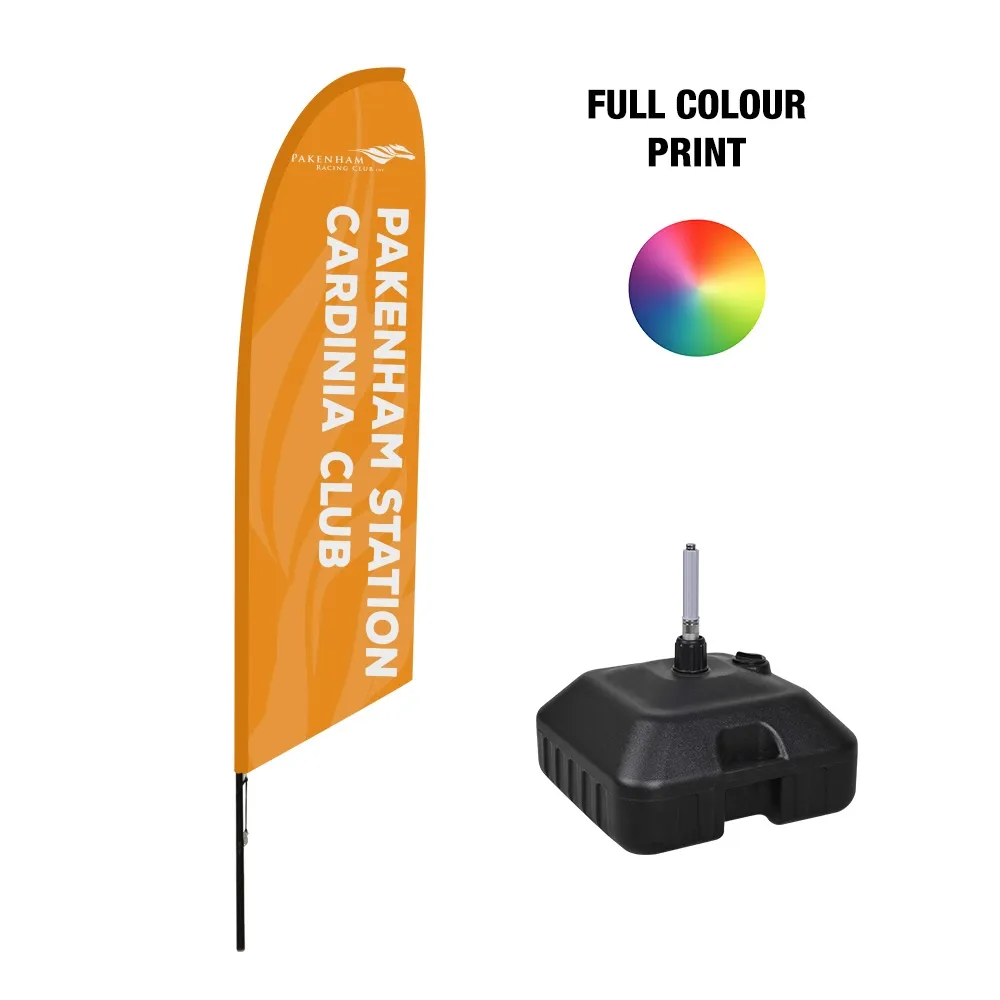 Feather flags, also known as flutter banner signs, are made from woven polyester to provide a durable flag that will last for years to come. Digital printing is used to create a vivid full colour display that has a true depiction of your custom designs that will get the attention of passersby. A reverse print on the back effectively turns this display into a dual-sided stand, maximising space and reaching more customers.
