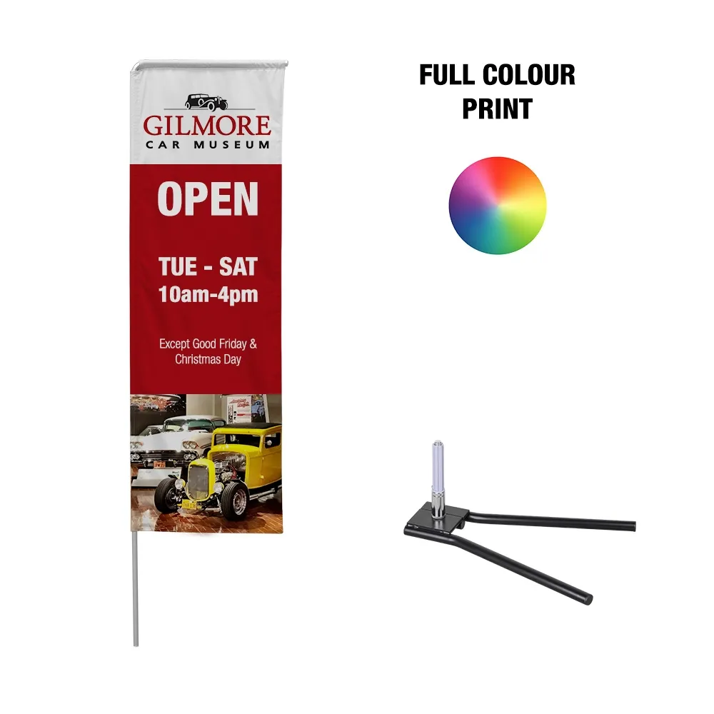 Street flags utilise your custom designs to gain the attention of passersby to inform them of your upcoming events, business name, and hours. These blade flags have your graphics digitally printed using a dye-sublimation process that ensures true colours as well as a true representation of your designs. The custom printed display uses woven polyester banners that are durable, with two types of printed options to choose from. The single-sided version has a reverse image on the back and the double-sided version uses two flags sewn together. A heavy duty metal pole is included to support both types of flags.