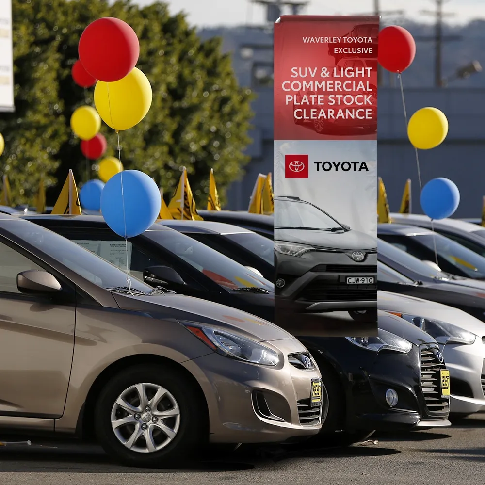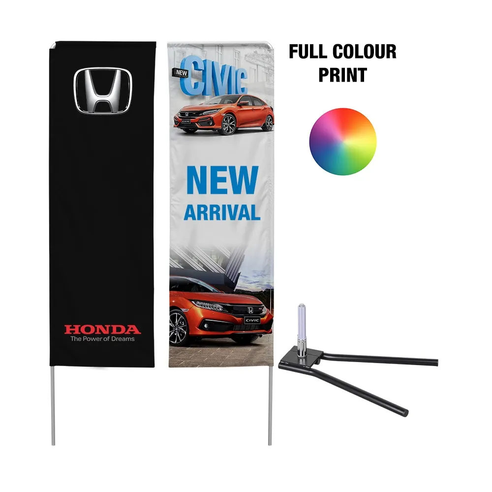 The marketing banners, rectangle flags use a car base to support that flag that is collapsible as well, unfolding for placement and using a silver peg that the metal pole slips over for assembly, with full set-up done in minutes with no tools needed! This base is meant to be placed under a car tyre, using the weight of the vehicle for full support and stabilisation. There is a nylon carrying bag included that holds all components for easy transport to and from events, with the added bonus of protection from grime and dust build-up during storage. Slimline Warehouse has quick shipping to anywhere in Australia from our warehouses in Melbourne, buy online today for quick dispatch to your location nationwide!