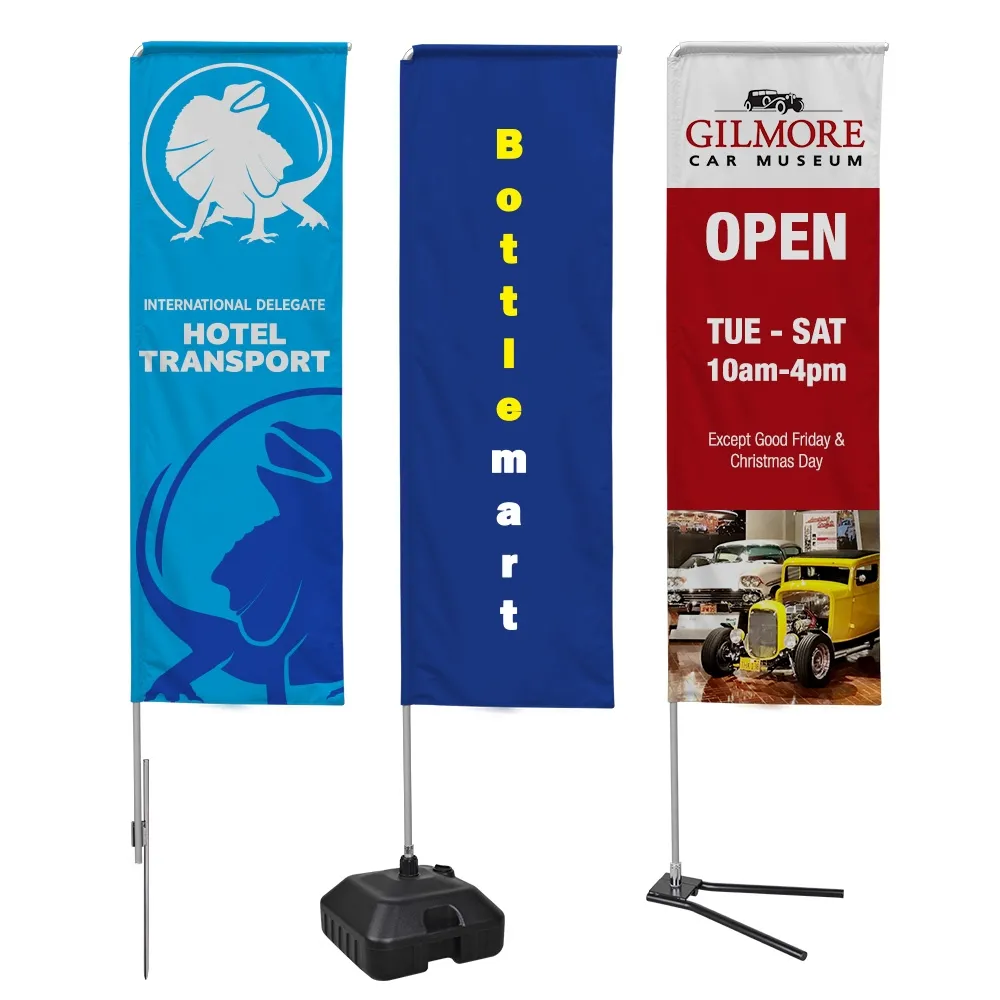 This rectangular flag have your custom designs digitally printed in full colour using a dye-sublimation process. This style of printing puts your graphics directly onto the fabric for an attention-grabbing look with rich colours and vivid imagery that is perfect for retail stores, exhibition halls, museums, restaurants, car dealerships, cafes, and more! The banner is designed for use with 3.1m rectangle flag kits with any style of base. The printing is only done on the front of the flag, but the imagery does bleed through to the other side to create a reverse image that turns the banner into a 2-sided display! The banner is made from polyester fabric that is suitable for outdoor or indoor use without worry. Design help is available from our in-house team of experts, with three tiers to choose from to meet your exact needs. Slimline Warehouse has fast shipping to anywhere in Australia, buy online today to have new graphics for your next event!