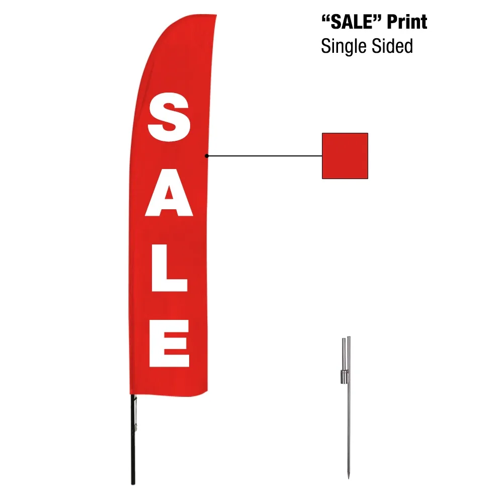 This retail sale banner is used to promote ongoing sales at different locations, effectively promoting to passersby whether they be in cars or on the pavement. The 3.1m tall flag is made from woven polyester fabric, holding up well to regular use outdoors and indoors alike. The word "SALE" is printed directly onto the fabric in whiter lettering against a red background that makes it easy to read thanks to the high contrast design. A reverse print of "SALE" is on the back of the flag as well to be visible in multiple directions at once.