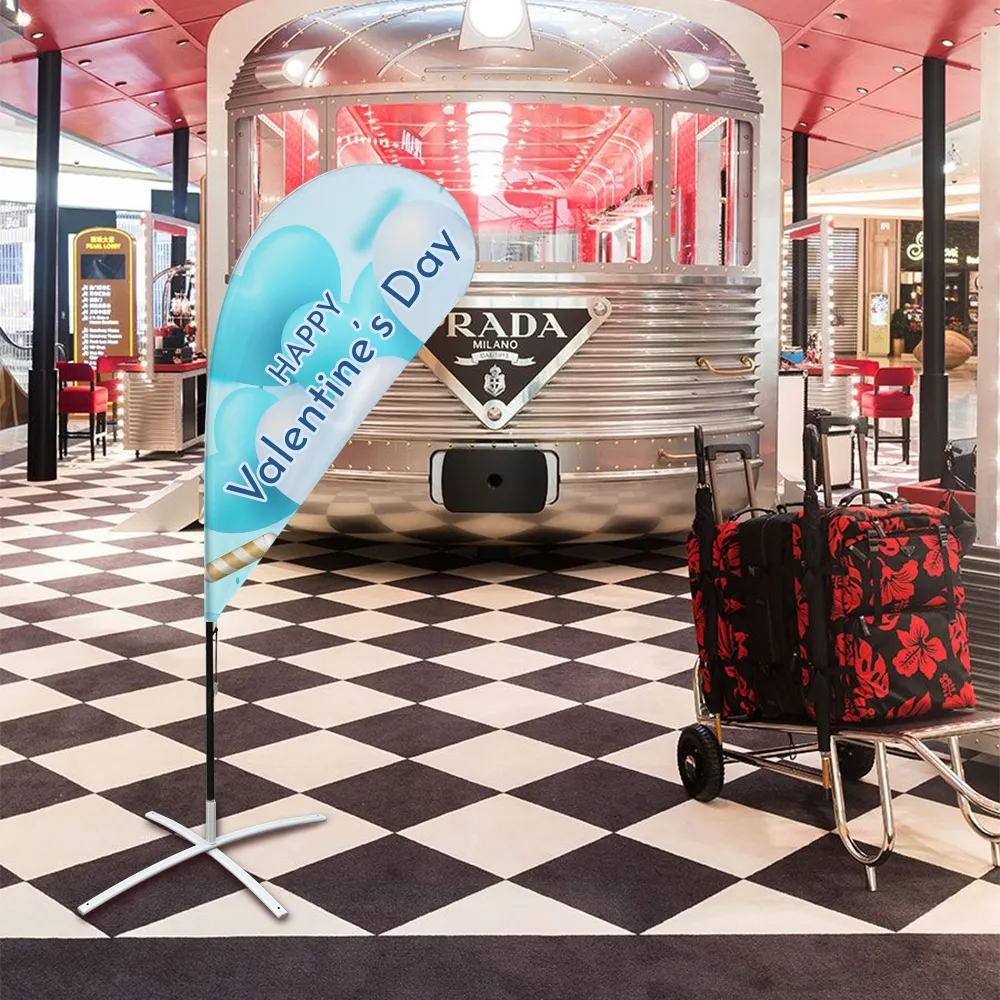 - Teardrop banner has a cross base that holds flag on flat surfaces indoors or outdoors