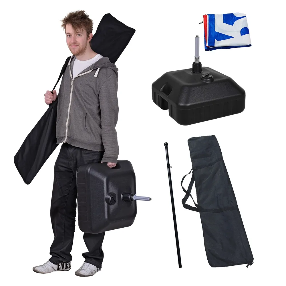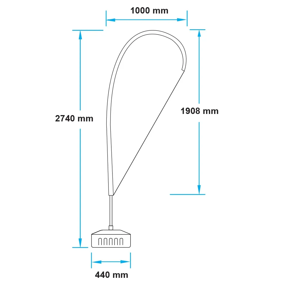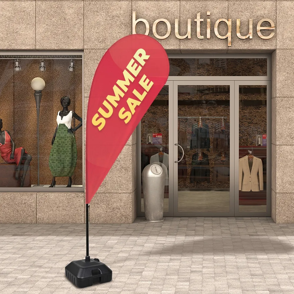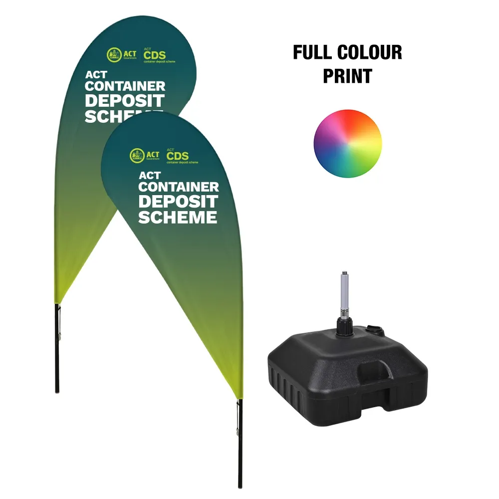 A tear drop flag uses a carrying bag for keeping the flag clean between events and easy transport between locations. The 2.7m tall banner utilise a hard plastic water base that can be used with water or sand to create a stable base for the flag, helping keep it upright during light winds and prevent it from easily be knocked over in heavily-trafficked public areas. There is a built-in handle that makes moving the flag into position simple as well. Assembly of the whole kit is easy with no tools needed too. The flagpole is made from metal and collapsible, designed to snap together quickly. An elastic strap is also included that helps keep tension in the fabric so it's easily readable by passersby.